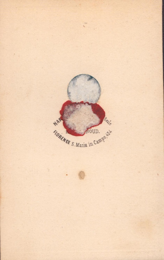 9,5x6cm Foto formato CDV Carte de Visite con ritratto a figura intera del compositore, periodo 1850, colorata, misure circa cm.9,5x6. Il nome VERDI in basso è un appunto ad inchiostro, non è la firma di Verdi. Al retro timbro Alphonse Bernoud , Naples - Florence , coperto da residui di carta di foglio d'album