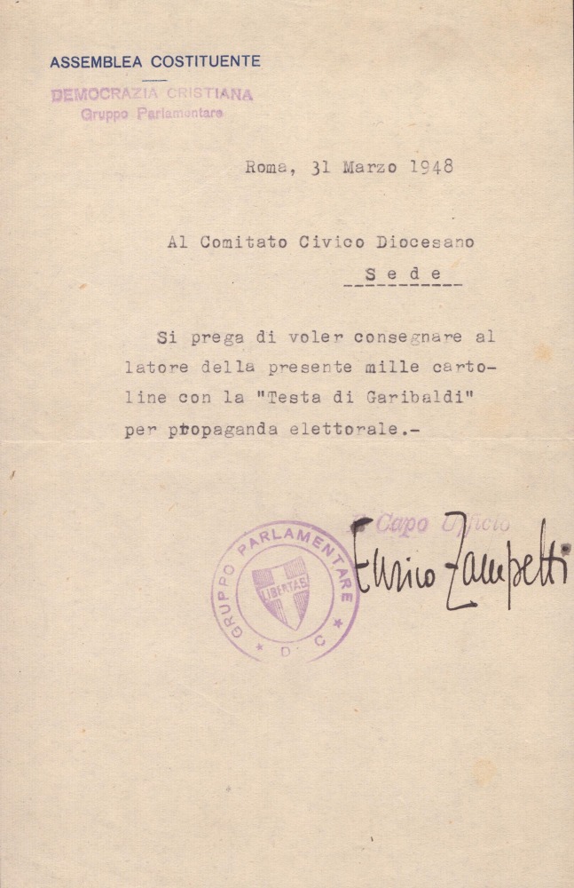 Lettera di un foglio su carta intestata ASSEMBLEA COSTITUENTE - Democrazia Cristiana - Gruppo Parlamentare , dattiloscritta il 31 Marzo 1948 dove si richiedono mille cartoline con la "Testa di Garibaldi" per propaganda elettorale.