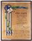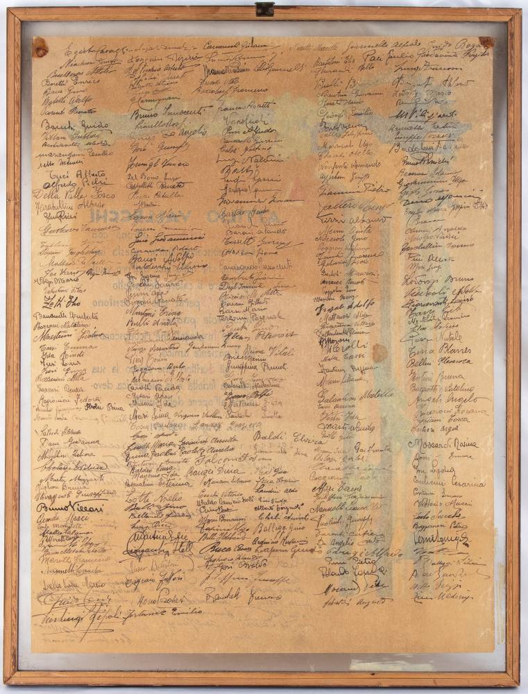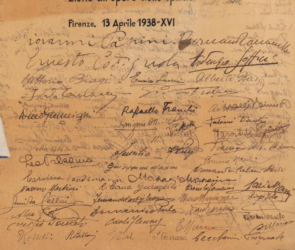 cm.37x50 Foglio in carta pergamena, dipinta a mano, donata ad Attilio Vallecchi dai suoi operai, impiegati, e dagli scrittori con il testo che recita "A Attilio Vallecchi Cavaliere del Lavoro offrono con lieto e concorde animo questa immagine, che nella luce dell'oro vuol significare il calore dell'affetto - gli Operai che lo sentono amorevole padre ; gl'Impiegati che riconoscono in lui il paziente amico ; gli Scrittori che sanno la sua fraterna fedeltà e la sua eroica devozione all'opere dello spirito. Firenze, 13 Aprile 1938 - XVI" - Seguono un grande numero di autografi scritti ad inchiostro nero dove si riconoscono Giovanni Papini, Ernesto Codignola, Ardengo Soffici. In cornice con doppio vetro, misure della pergamena circa cm.37x50. In ottime condizioni