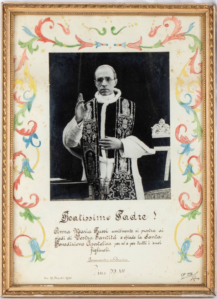 cm.30x40 Foto ufficiale di Papa Pio XII benedicente, applicata su benedizione apostolica del 29 Marzo 1945 rilasciata ad una fedele. Timbro a secco FOTO FELICI riproduzione interdetta. Benedizione autografatata di pugno dal pontefice ad inchiostro nero