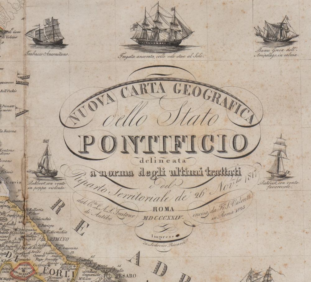 Grande carta dello Stato Pontificio delineata dal cartografo Trestour di Antibo a norma del reparto territoriale del 26 novembre 1817, incisa da Francesco S. Valenti nel 1823, impressa e pubblicata a Roma nel 1824 da Lodovico Riccardi.