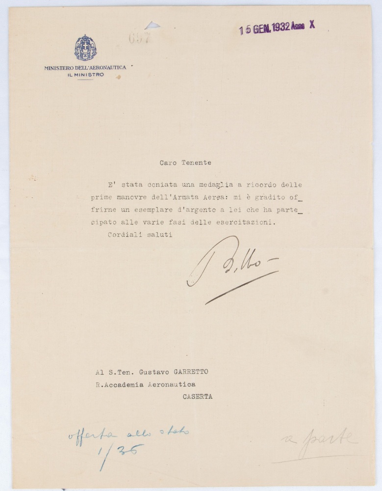 La lettera parla della istituzione della medaglia a ricordo delle manovre dell'Armata Aerea, ed il ministro Balbo ne offre un esemplare d'argento al tenente della Regia Accademia Aeronautica che ne prese parte.
