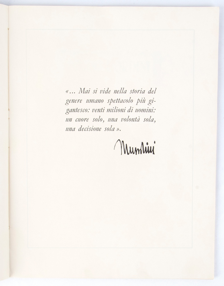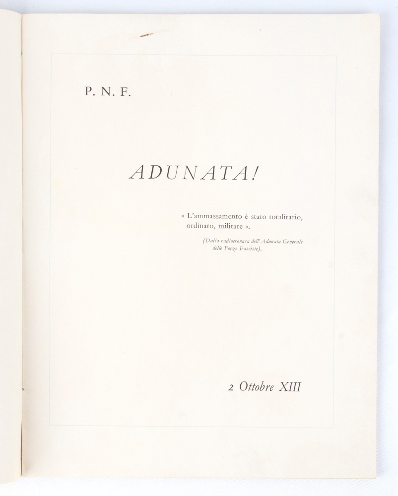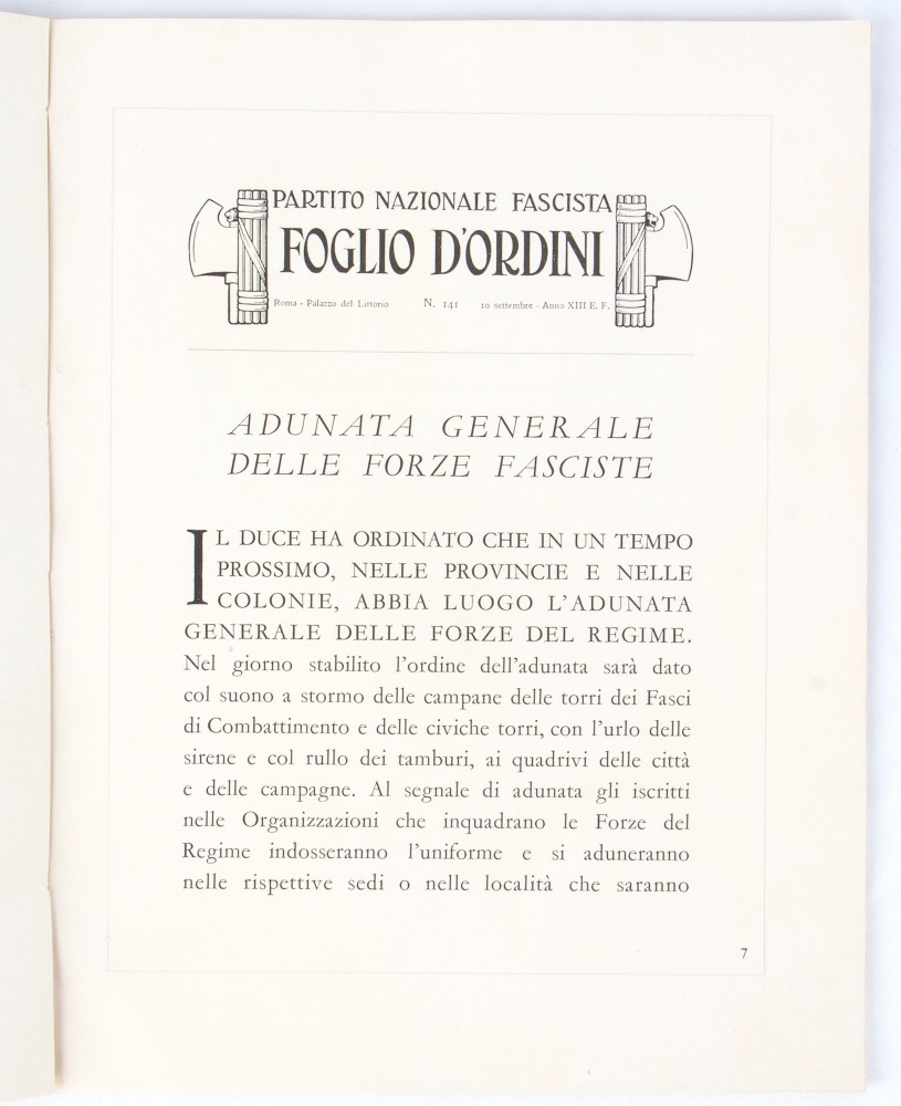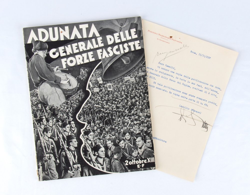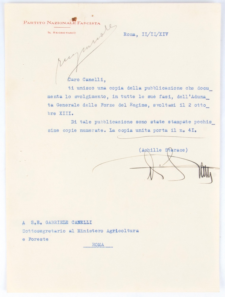 Pubblicazione speciale dal titolo ADUNATA GENERALE DELLE FORZE FASCISTE avvenuta il 2 Ottobre 1934 , in brossura editoriale, "Stampato in Roma nelle Officine dell'Istituto Poligrafico dello Stato ... In Cinquecento Esemplari Numerati da 1 a 500" questo è l'esemplare numero 41. Il volume è accompagnato da una lettera dattiloscritta del Segretario del Partito Nazionale Fascista , datata "II / II / XIV" e firmata autografa da Achille Starace ad inchiostro nero, che ne certifica la numerazione 41 al destinatario S.E. CANELLI Sottosegretario al Ministero Agricolture e Foreste.