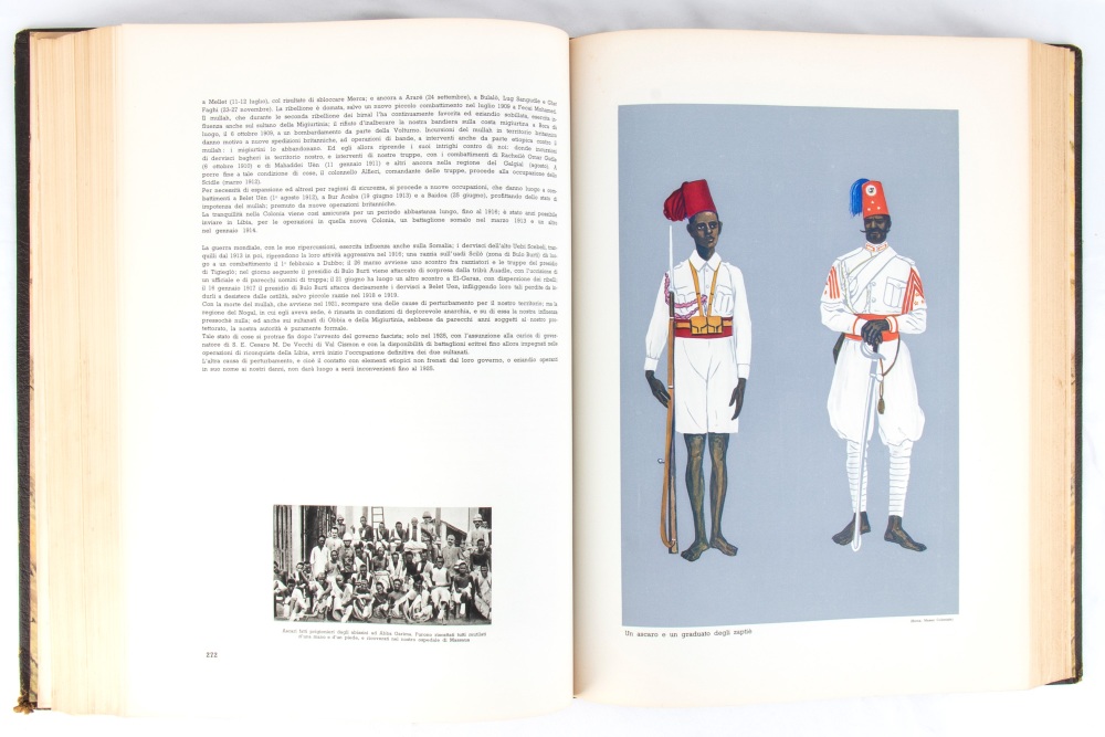 Opera monumentale a cura di Mario Giordano, per l'Istituto Geografico De Agostini Novara, prima edizione del 1936. Ricco apparato iconografico con carte fisico-politiche, cartine dimostrative, 4 carte a colori f.t. di cui 3 ripiegate, 3 tavole a piena pagina a colori con riproduzioni di dipinti conservati presso il Museo Coloniale di Roma, numerosissime fotografie. Frontespizio in quadricromia. Copertina rigida, pagine 568. Misure cm.41,5x32,5