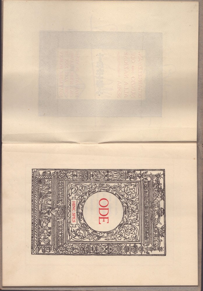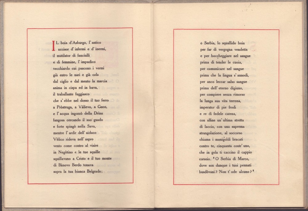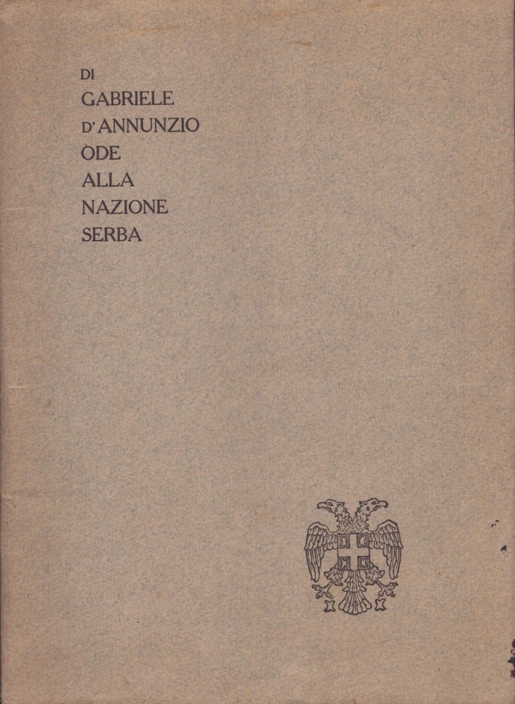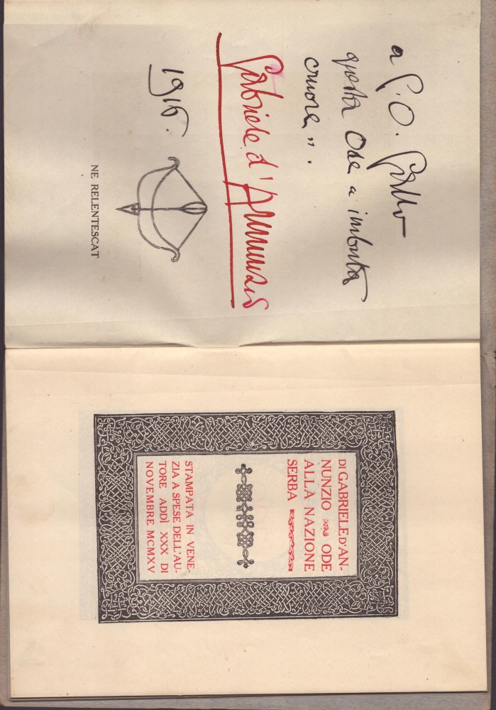 cm.14,3x19,8 Dedica e firma autografe di Gabriele d'Annunzio, all'interno del voume dal titolo "ODE ALLA NAZIONE SERBA" , "Stampata in Venezia a spese dell'autore addì XXX di novembre MCMXV" - Inchiostro nero e rosso. Primo frontespizio stampato in rosso entro cornice nera, secondo frontespizio (nero e rosso) "Ode. Hinc spes". Al controfrontespizio stampa "Ne relentescat" sotto arco e freccia , sormontata dalla dedica autografa di d’Annunzio indirizzata a G.O. Gallo , 1916. Carte protette da cartoncino originale grigio azzurro recante stemma serbo in basso a destra. Fogli spillati, mancante il cordoncino rosso. Ottime condizioni, misure cm.14,3 x 19. Molto raro
