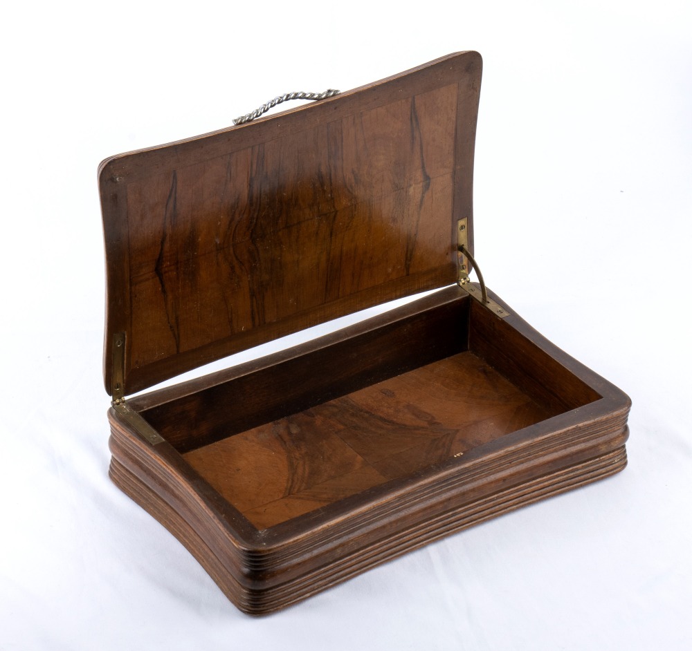 Bella scatola portasigari , in legno, con placca uniface in argento punzonata 800, stampo a rilievo raffigurante Gabriele D'Annunzio in uniforme da comandante dei reparti d'assalto dei Legionari di Fiume, con motto EIA PATRIA DEL CARNARO ALALA' ! - Presumibile dono del Vate a qualche personalità sua amica. La placca è disegnata dall'architetto Giannino Castiglioni - Misure della placca mm.58x76. In perfette condizioni