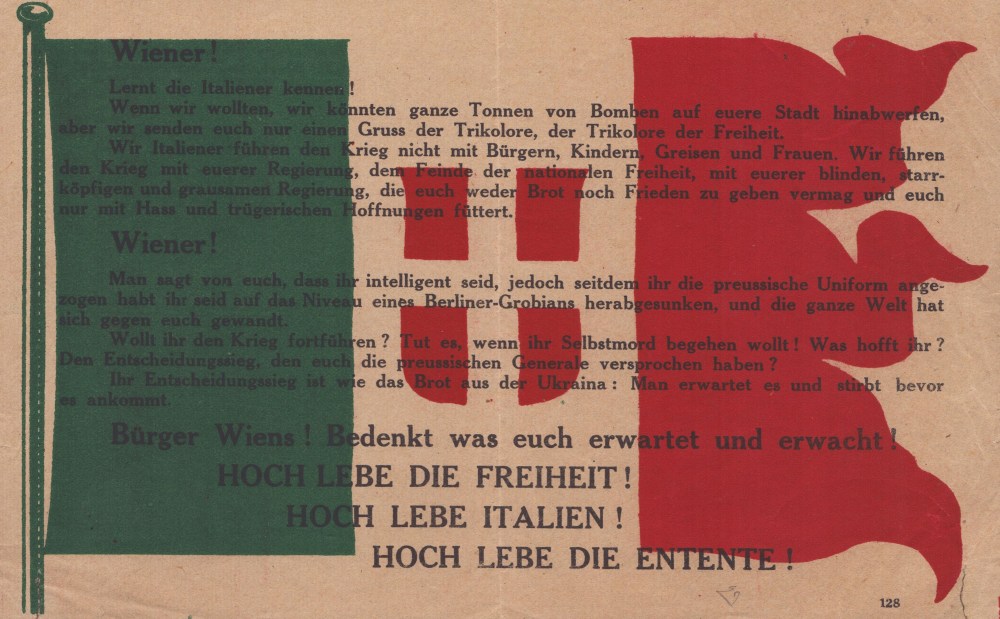 Wir Italiener führen den Krieg nicht mit den Bürgern, Kindern, Greisen und Frauen. Wir führen den Krieg mit eurer Regierung, dem Feinde der nationalen Freiheit, mit euren blinden, starrköpfigen und grausamen Regierung, die euch weder Brot noch Frieden zu geben vermag und euch nur mit Hass und trügerischen Hoffnungen füttert.