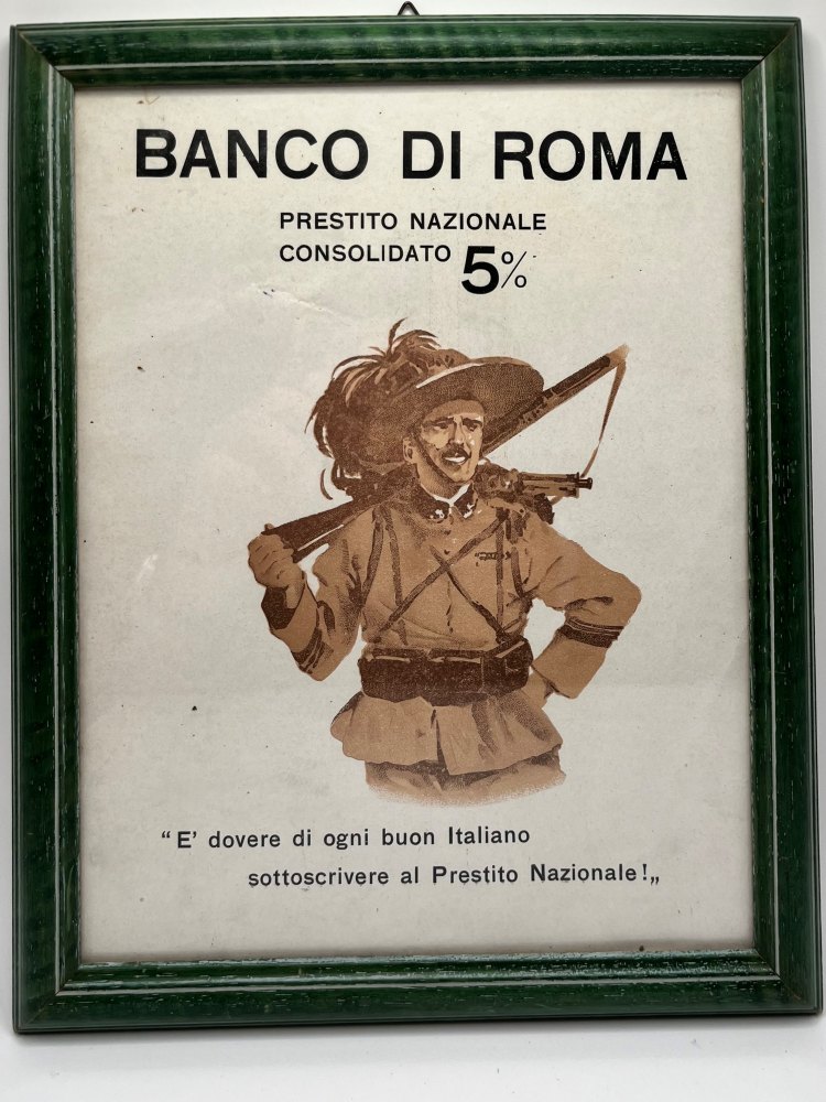 Locandina del Banco di Roma per il prestito nazionale consolidato al 5% - "E' DOVERE DI OGNI BUON ITALIANO SOTTOSCRIVERE AL PRESTITO NAZIONALE"