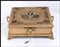Scatola porta documenti in legno, rivestita in pelle, con due manici laterali, quattro piedi di appoggio e ferramenta in bronzo dorato, smalti colorati con dettagli guilloche, particolari in lamina d'argento o metallo argentato. Usata per contenere un premio o dei documenti di riconoscimento per un alto funzionario dello stato austriaco, o persona di merito, in occasione della "ESPOSIZIONE INTERNAZIONALE TEDESCA del 1903", come evidente dall'incisione "ALLGEMEINE DUTSCHE AUSSTELLUNG AUSSIG 1903". Iniziali "C A" con corona dorata applicata, smalti bianco e rosso in stemma centrale; il fregio di sinistra (smalti colorati con aquila bicefala dall'impero Asburgico) ed il fregio di destra (smalti colorati con leone elmato) a rappresentare il simbolo della città di Ústí nad Labem - Aussig, all'epoca Austria, ora città cecoslovacca; serti di alloro e quercia; medaglioni con applicazioni in probabile argento dei simboli delle arti e mestieri ai quattro angoli del coperchio; serti di alloro e quercia in lamierino argentato, a smalti dorato, verde e rosso; cerniere con dettagli smaltati; pelle color rosato con ricami dorati. La scatola si apre da una serratura a scomparsa, con un grande vano portaoggetti rivestito in velluto rosso.