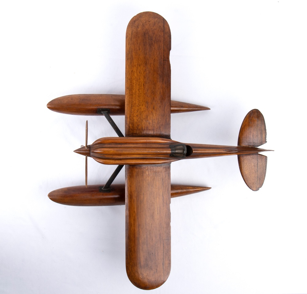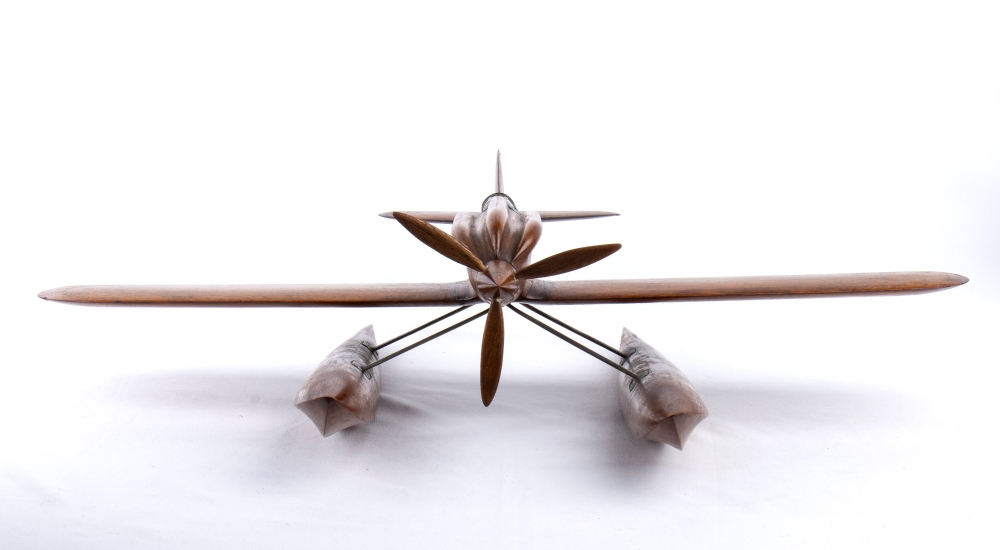 legno cm.48x41x15 Straordinario modello da galleria del vento del MACCHI M.39 idrocorsa (idrovolante da corsa) con configurazione a scarponi, monomotore e monoplano ad ala bassa sviluppato dall'azienda aeronautica italiana Aeronautica Macchi per partecipare alla Coppa Schneider del 1926. Elica rotante, carlinga con struttura in metallo, supporti di giunzione degli scarponi in metallo. Apertura alare circa cm.48, lunghezza cm.41, altezza circa cm.15 - Modello originale della seconda metà degli anni '920, in eccellenti condizioni