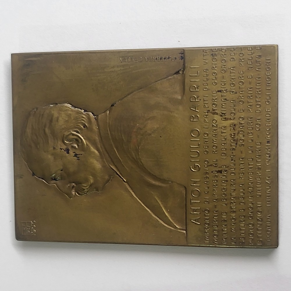 mm.45x64 Placchetta in bronzo firmata "F de A 1906" commemorativa di Anton Giulio Barrili promossa dalla Associazione Ligure dei Giornalisti, in scatolina originale. Misura circa mm.45x64, ottime condizioni