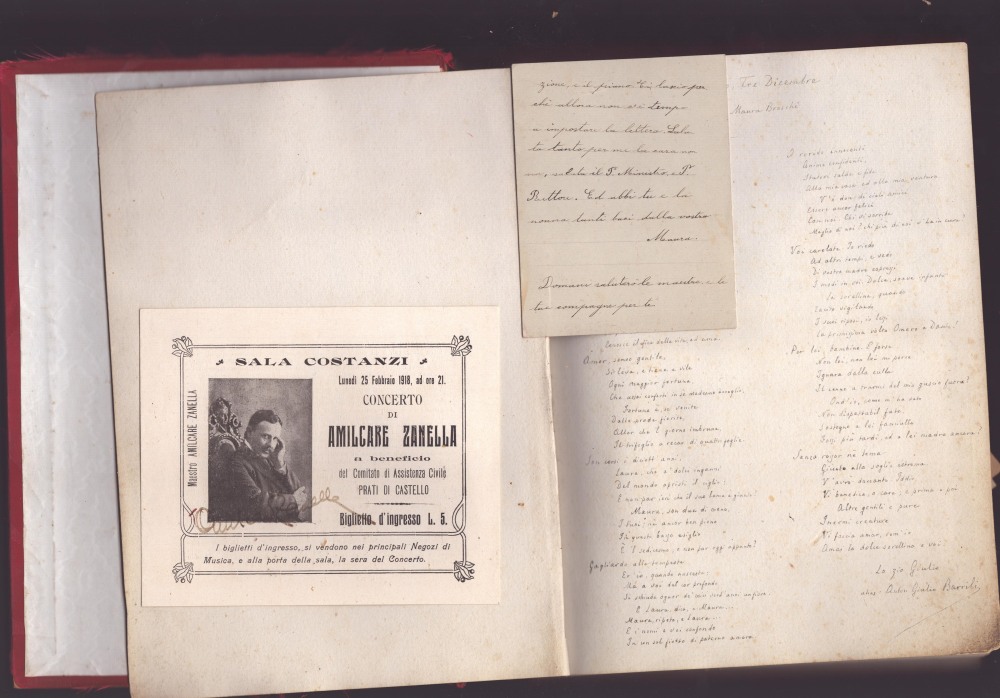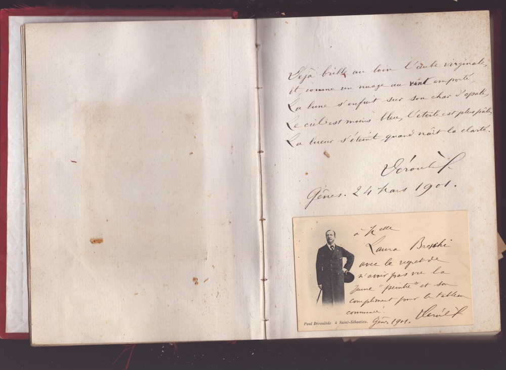 In ordine troviamo : una pagina intera con  componimento poetico autografo di Anton Giulio Barrili dedicato alle nipoti Laura e Maura; due cartoline fotografiche con dedica e firma di Miecio (Mieczyslaw) Horszowski (pianista 1892-1993); un ritratto della giovane Laura a china dedicato e firmato Luigi Gallina '99 (pittore 1865-1931); un componimento poetico autografo ed una cartolina con dedica ed autografo di Paul Déroulede (scrittore 1846-1914); una cartolina fotografica con dedica e firma autografe di Cesare Pascarella (pittore, poeta romanesco 1858-1940) ed un disegno originale a china, di un asino A FRATEL MIO PAZIENTE!  autografato sempre da Cesare Pascarella; una dedica con firma autografe di Leopoldo Fregoli (il trasformista, 1867-1936); un rigo musicale con dedica e firma autografi di Ruggero Leoncavallo (compositore 1857-1919); una cartolina con rigo musicale dedicato ed autografato da Umberto Giordano (compositore 1867-1948); lettera/racconto di 4 pagine con dedica autografe di Luigi Morandi scrittore, poeta e garibaldino con Barrili (1844-1922); una poesia con firma autografe di Rosmunda Tomei Finamore (1864-1955); cartolina fotografica con dedica e firma di Smara (Smarande) Gheorghiu poetessa rumena e attivista movimento femminista (1857-1944); una caricatura ad inchiostro china seppia di P.G.Breschi firmata da GANDOLIN (Luigi Arnaldo Vassallo disegnatore e direttore del Secolo XIX di Genova); e poi una piccola brochure firmata da Amilcare Zanella, ed altri 8 autografi vari (Ferdinando Martini, ed altri)
