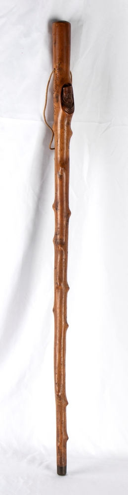 cm.100 Cimelio ricordo da Caprera, bastone in legno con intagliata l'effige di Garibaldi, Mezzo busto dell'Eroe dei Due Mondi con poncho e berretto ricamato.