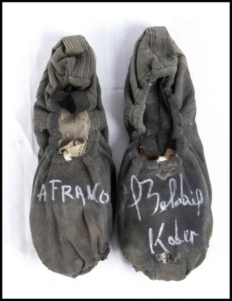 Paio di scarpette "mezzepunte" da danza, in tessuto nero, con dedica ed autografo originali scritti a pennarello indelebele bianco da Kader Belarbi. Usate nel "Prelude à l'après Midi d'un Faune". Ballerino di danza classica dal 1980 al 2008 circa, nominato ETOILE da Rudolf Nureev nel 1989. "Danseur étoile" (per gli uomini) o danseuse étoile (per le donne), letteralmente "ballerino stella", è il più alto grado che un ballerino può raggiungere al Balletto dell'Opera di Parigi.