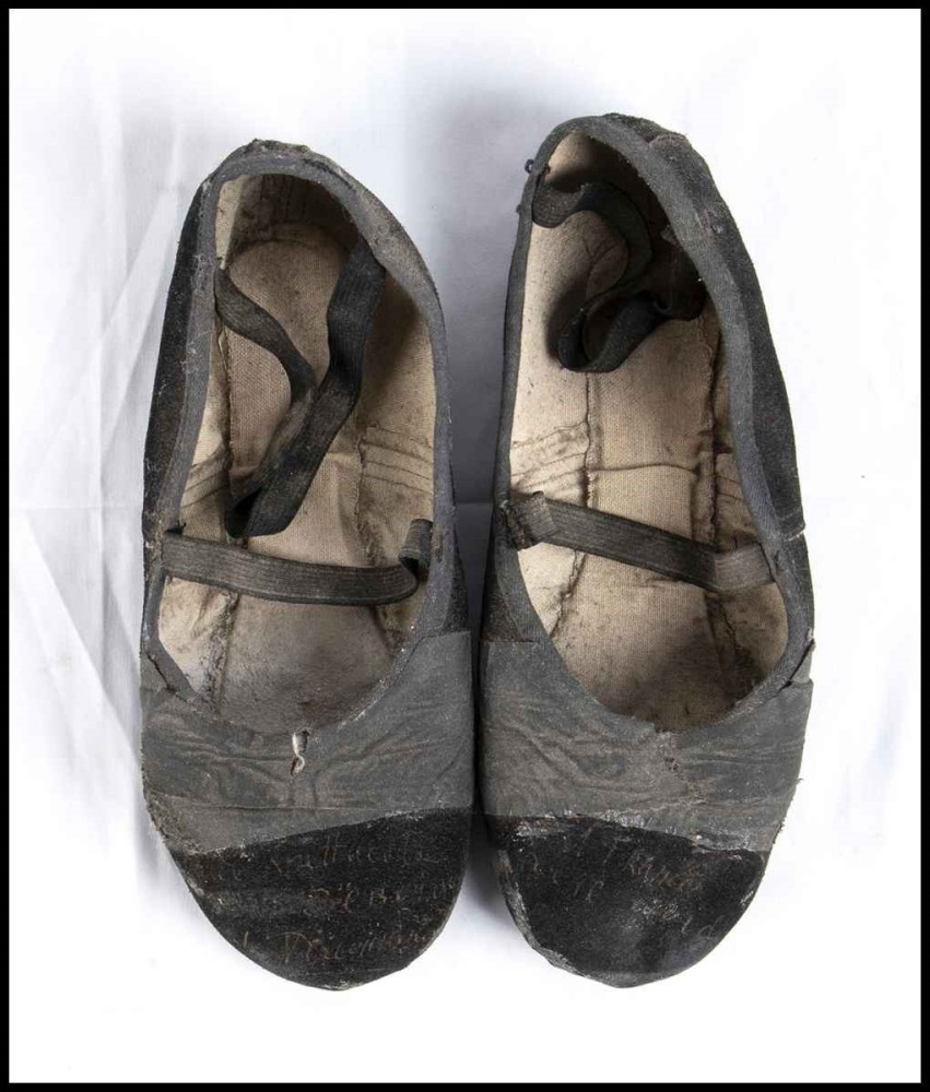 Paio di scarpette "mezzepunte" da danza classica, in tessuto e pelle nera, con dedica ed autografo originali scritti a pennarello bianco, da Vladimir Derevianko. Usate per "L'enfant et les sortileges". Ballerino di fama mondiale, attualmente maestro alla Scuola del Balletto di Roma. Nel 1977 entra a far partedella Compagnia del Teatro Bolshoi dove grazie alle sue straordinarie qualità, ben presto,diviene primo ballerino, lavorando con alcuni dei grandi miti come GalinaUlanova, Vladimir Vassiliev, Raissa Struckova e Vladimir Nikonov, Ekaterina Maximova e Liudmilla Semenyaka.