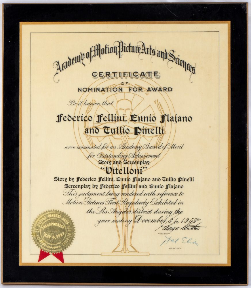 La nomination recita "Academy of Motion Picture Arts and Sciences - Certificate of nomination for award - be it known that - Federico Fellini, Ennio Flajano and Tullio Pinelli - were nominated for an Academy Award of Merit for Outstanding Achievement - Story and Screenplay - "VITELLONI" - Story by Federico Fellini, Ennio Flajano and Tullio Pinelli - Screenplay by Federico Fellini and Ennio Flajano - This judgement being rendered with reference to - Motion Pictures First Regularly Exhibited in - the Los Angeles during the year ending December 31, 1957" firmato autografo in calce ad inchiostro nero dal Presidente George Seaton ed inchiostro blu dal Segretario dell'accademia per gli Oscar.