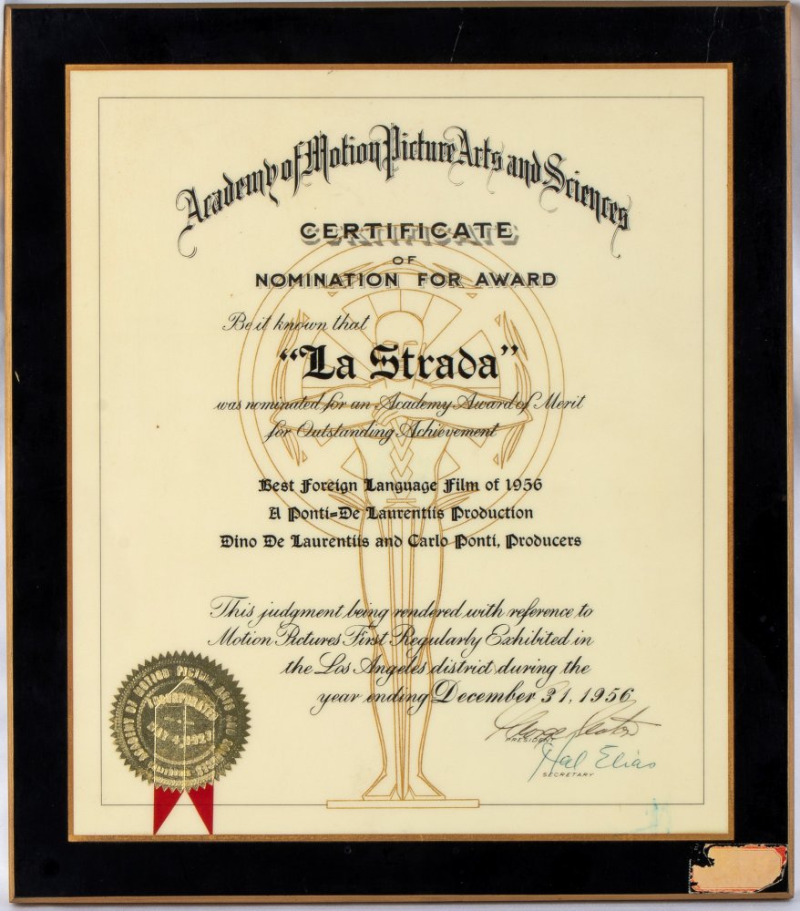 Prestigioso Certificato di Nomination all'Oscar della cinematografia per la categoria "Miglior film in lingua straniera" del film in concorso, assegnata alla produzione Dino De Laurentiis e Carlo Ponti per il film "La strada" di Federico Fellini.