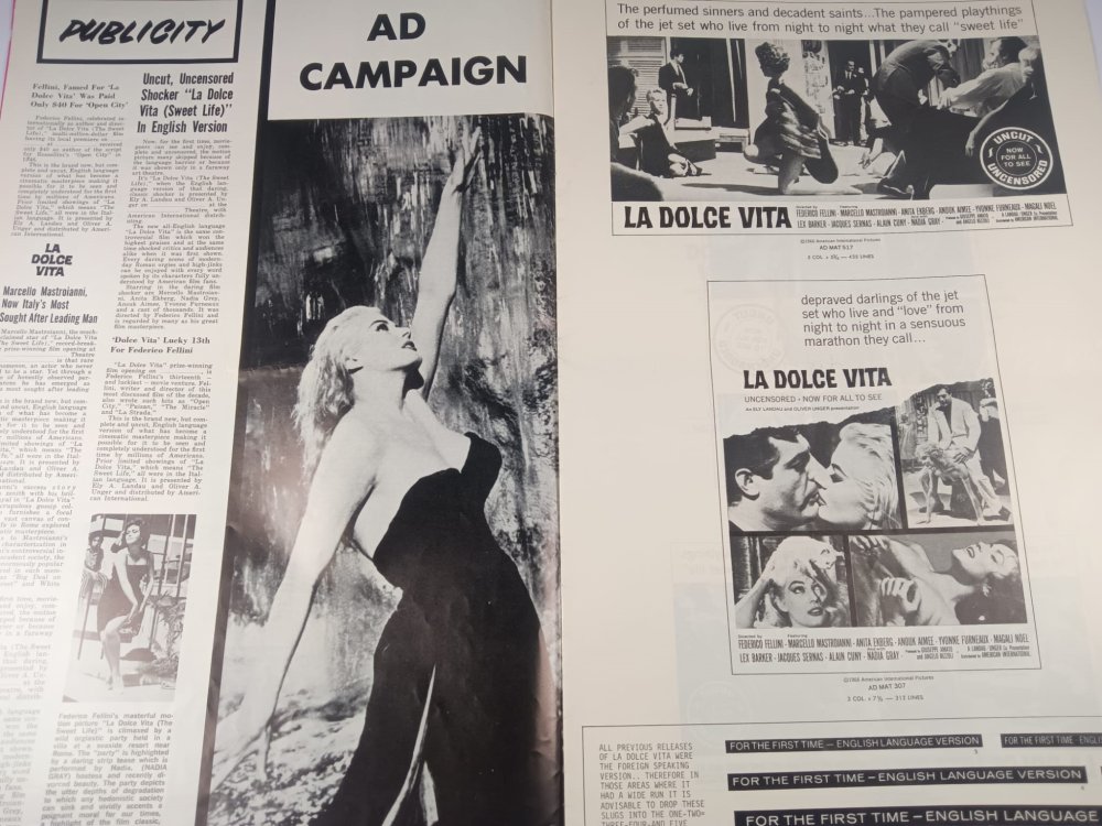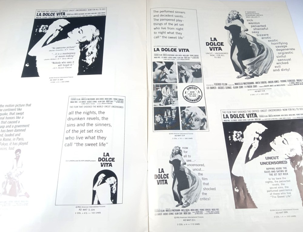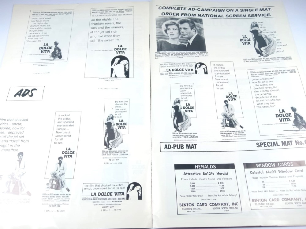 cm.28x43 Grande brochure originale del film LA DOLCE VITA 1960, prima edizione per il mercato USA. E' composta da 16 pagine e contiene foto, dettagli e tutto il materiale promozionale inclusi i manifesti e lobby card.