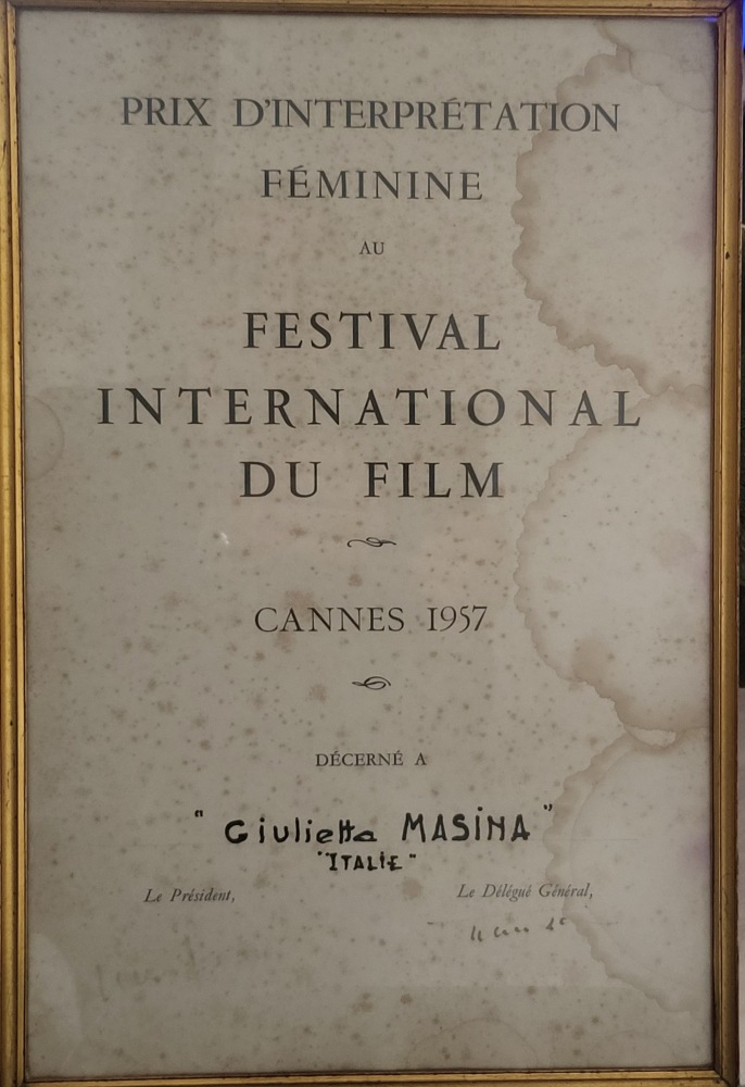 Documento originale, consegnato alla Masina in occasione della premiazione di Cannes (come testimoniato da fotografie facilmente reperibili sul web) che riporta "PRIX D'INTERPRETATION FEMININE - AU - FESTIVAL INTERNATIONAL DU FILM - CANNES 1957 - DECERNE' A GIULIETTA MASINA - ITALIE "