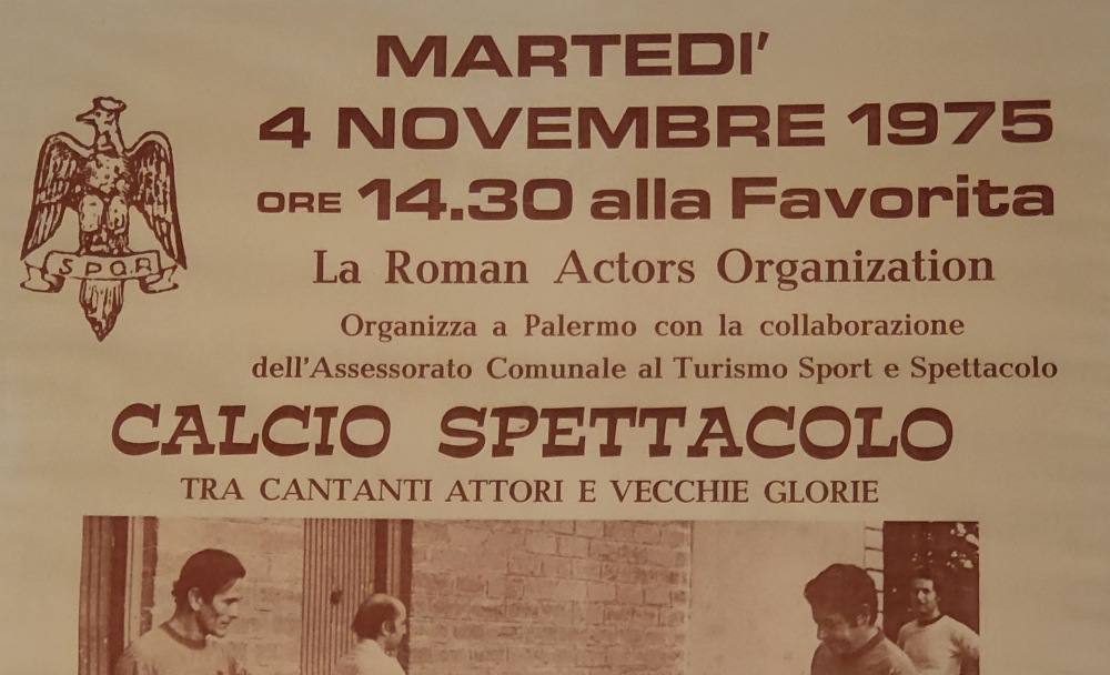 Il testo recita "MARTEDI' 4 NOVEMBRE 1975 ore 14.30 alla FAVORITA - La Roman Actors Organization - Organizza a Palermo con la collaborazione dell'Assessorato Comunale al Turismo Sport e Spettacolo - CALCIO SPETTACOLO - tra cantanti attori e vecchie glorie - Scenderanno in campo : Pier P. Pasolini, Philippe Leroy, Ninetto Davoli, Franco Franchi, Fabio Testi, Don Bachy, Sergio Leonardi, Franco Citti, Franco Interlenghi, Enrico Montesano, Maurizio Merli, Scarpantibus (Cap. Navarro), Il Guardiano del Faro, Da Costa, Charles Palmer, Mario Marenco, Antonio Sabato, Manfredini, Raf Vallone, Pino Caruso, Paolo GIusti - Il calcio d'inizio sarà dato da una nota Attrice - Ingresso Tribuna L.3000 - Gradinata L.2000 - Popolari L.1000"