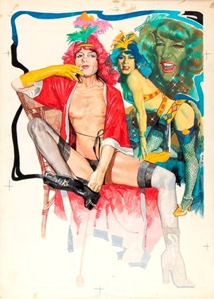 Bozzetto originale realizzato da Pietro Ermanno Iaia, sicuramente il più noto illustratore italiano, firmato sul lato destro, per il film GAY SALOME' , genere erotico-noir anni '80. Olio su cartoncino.