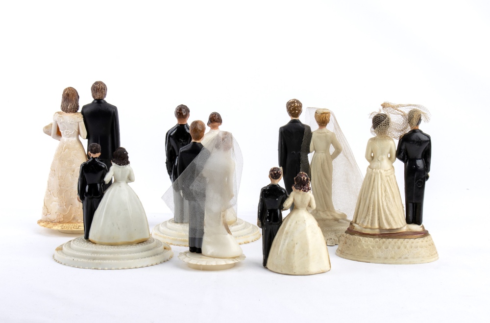 Composizione Lotto di 7 coppie di sposi in abito da cerimonia, plastica e vario, metà XX secolo. Misure cm.7-13, in ottime condizioni