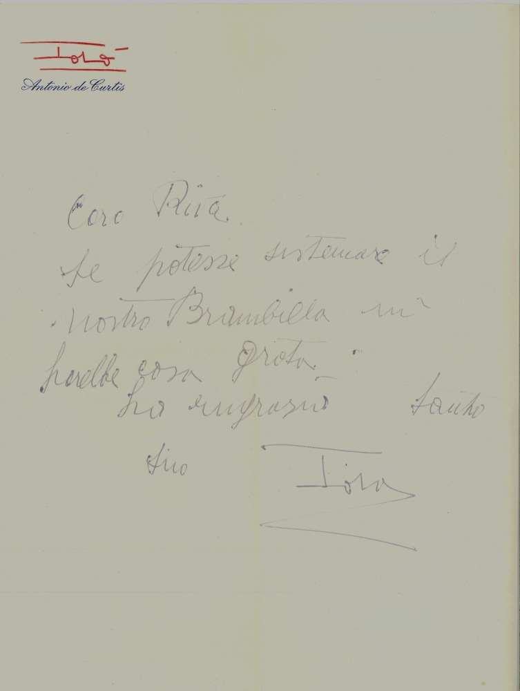 Lettera su carta intestata "TOTO' Antonio De Curtis" con logo a rilievo, anni 50, indirizzata a Mario Riva in cui Totò, scrivendo di suo pugno con firma, presenta e raccomanda il ragionier Brambilla. Di conseguenza il ragionier Brambilla lavorò molto tempo al servizio di Mario Riva.