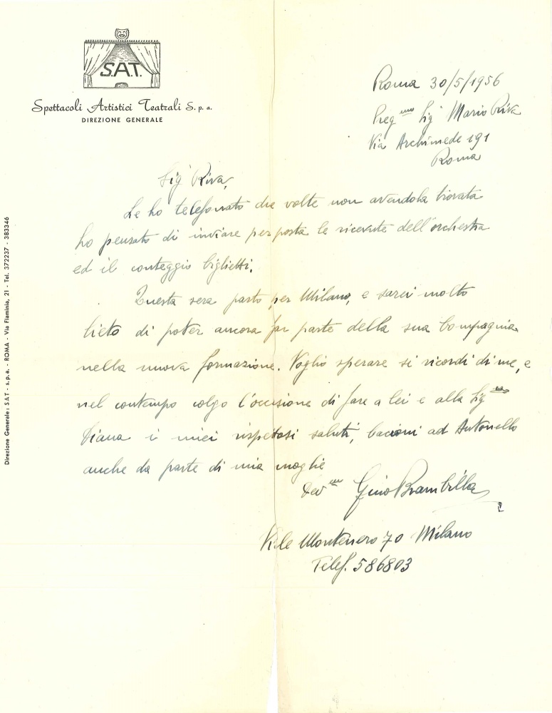 E' inclusa anche una seconda lettera su carta intestata "SAT Spettacoli Artistici Teatrali" indirizzata a Mario Riva dello stesso ragionier Brambilla in cui offre di nuovo i suoi servigi.