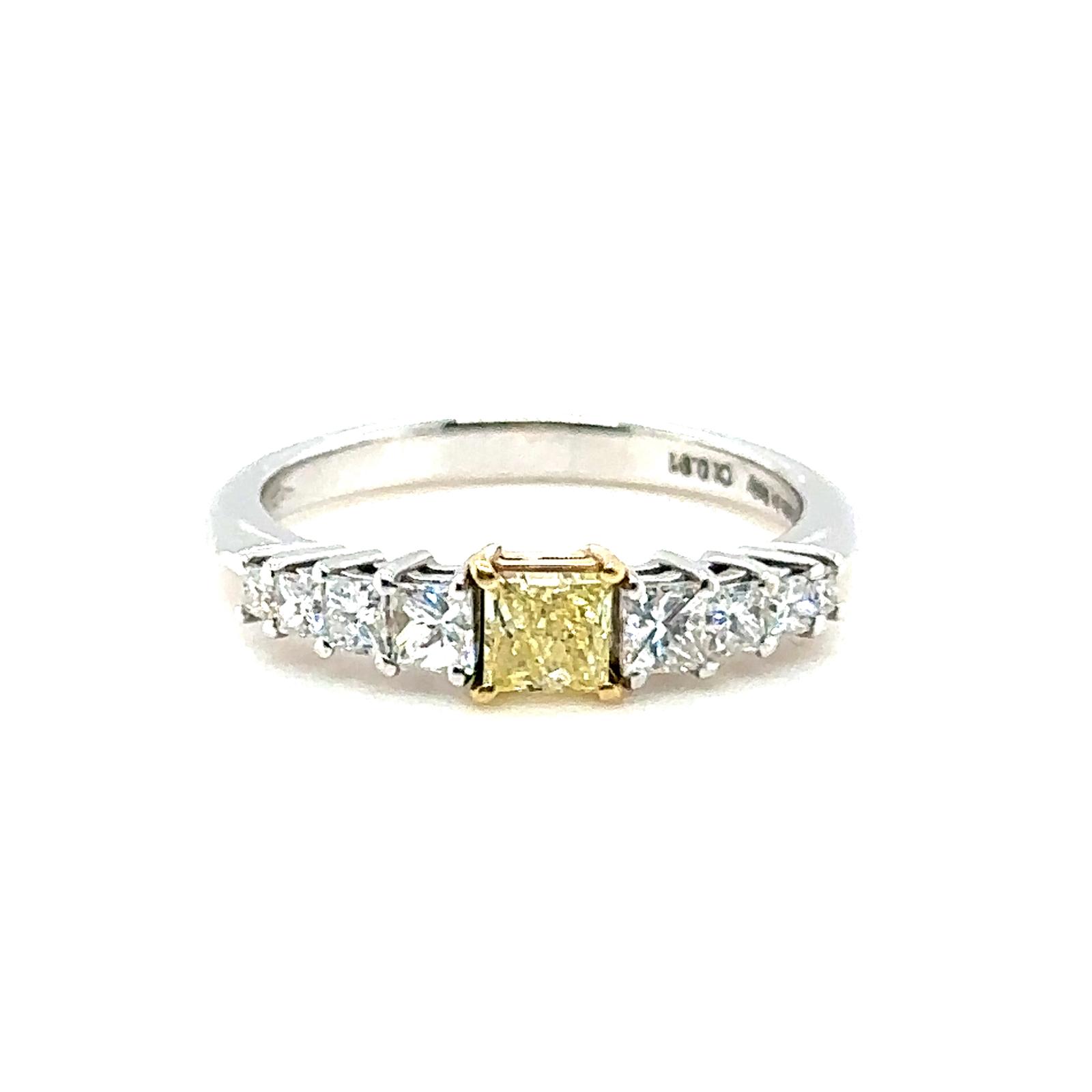 ANELLO IN ORO BIANCO 18K 3.28 GR CON DIAMANTE CENTRALE PRINCESS DA 0.40 CARATI COLORE FANCY GIALLO - PUREZZA SI2 + DIAMANTI LATERALI PER 0.51 CARATI COLORE E-F PUREZZA VS2-SI1 - TAGLIA - 7 - CERTIFICATO GEMMOLOGICO MAROZ DIAMONDS LTD MEMBRO ISRAEL DIAMOND EXCHANGE - JG404038