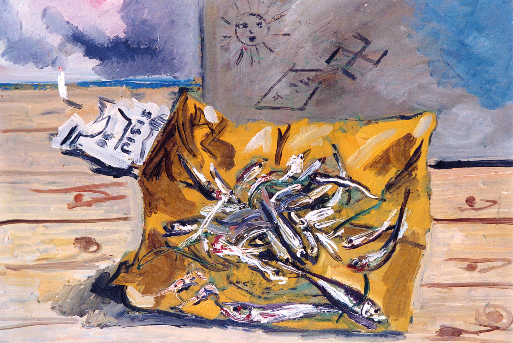 Filippo De Pisis (Ferrara 1896 - Mailand/Milano 1956) Natura morta con aringhe, Anni ‘30;Olio su cartone, 49 x 71 cm