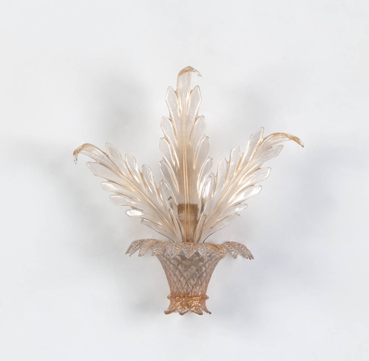 Seguso Vetri d’arte Murano Applique ad una luce Hotel Bristol Merano, 1953/54;Cosiddetta a "nido d’amore", finale in vetro color oro, composta da 3 foglie