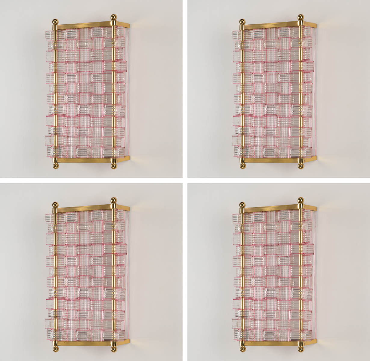 Flavio Poli Quattro applique Hotel Bristol Merano, 1953/54;Listelli lineari e ondulati in vetro zigrinato trasparenti color rubino, struttura in ottone, H. 38,5 cm x 11 x 11 cm. Elementi provenienti da un grande lampadario realizzato dalla Seguso Vetri d’arte Murano per l’Hotel Bristol di Merano. Struttura nuova