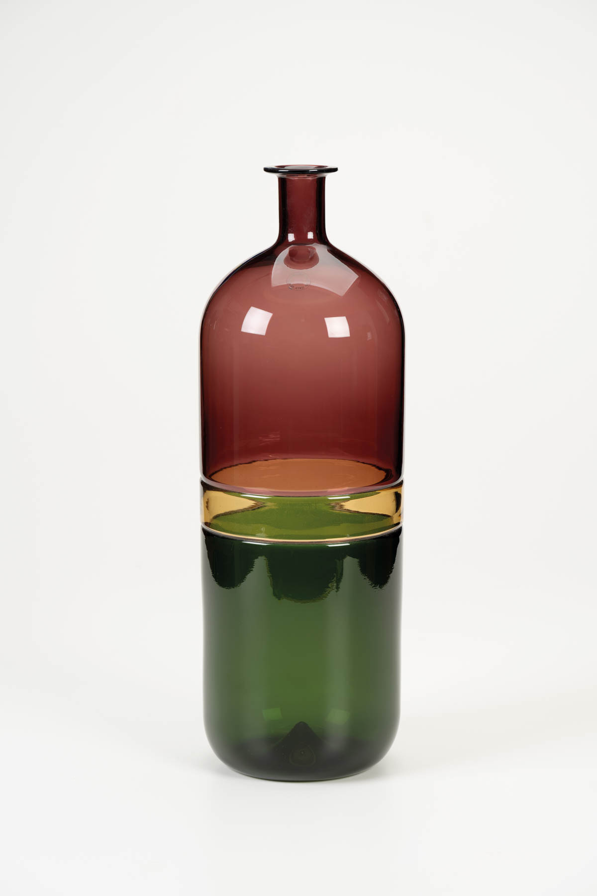 Tapio Wikkala Bottiglia della serie "Bolle", 1990;Bottiglia in vetro soffiato leggero e lavorato ad "incamo" a mano, h. 40 cm. Produzione Venini Murano