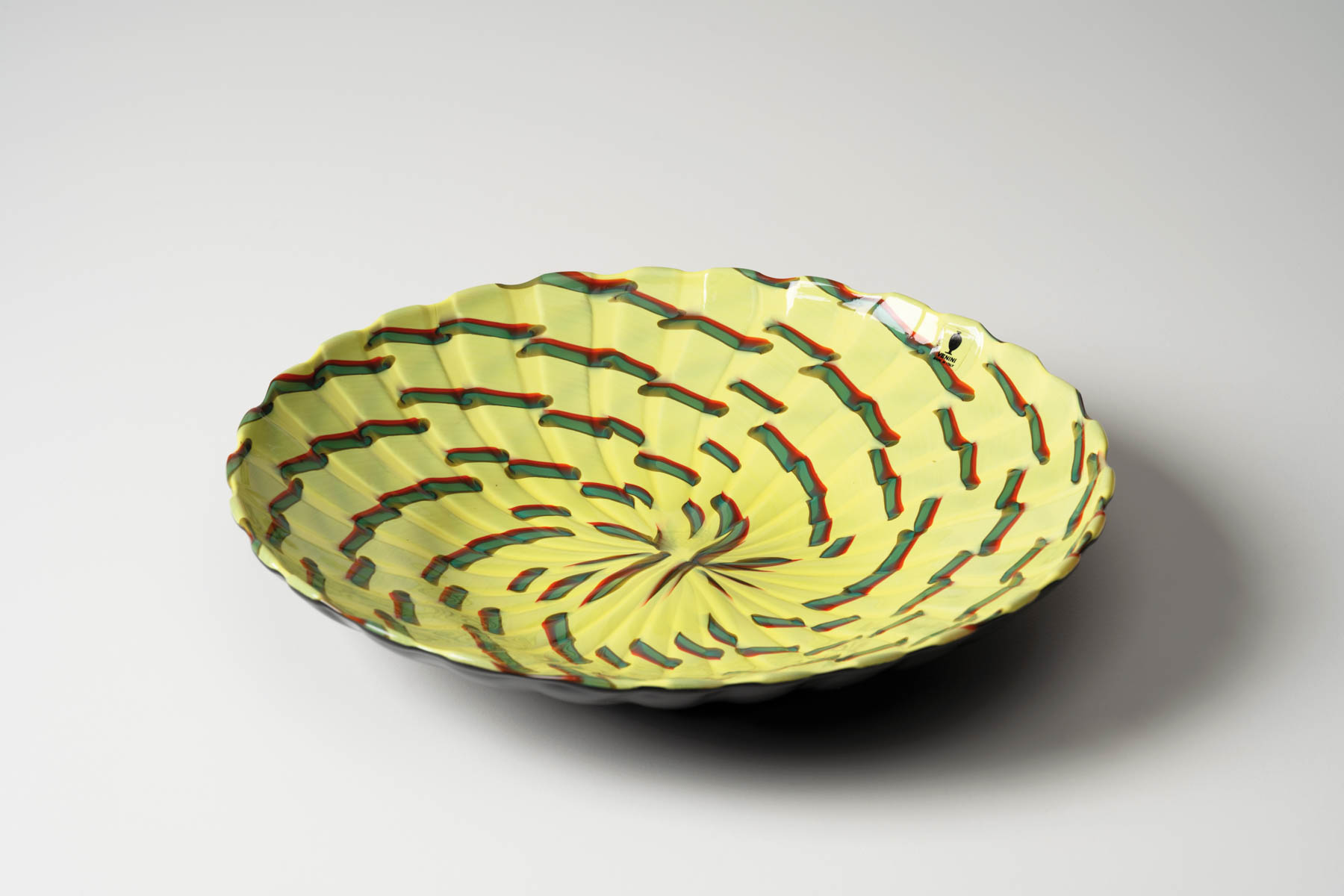 James Carpenter Piatto della serie "Calabash", 1981;Vetro soffiato e lavorato a mano con canne opache "zanfirico" multicolori, h. 22 cm. Produzione Venini Murano