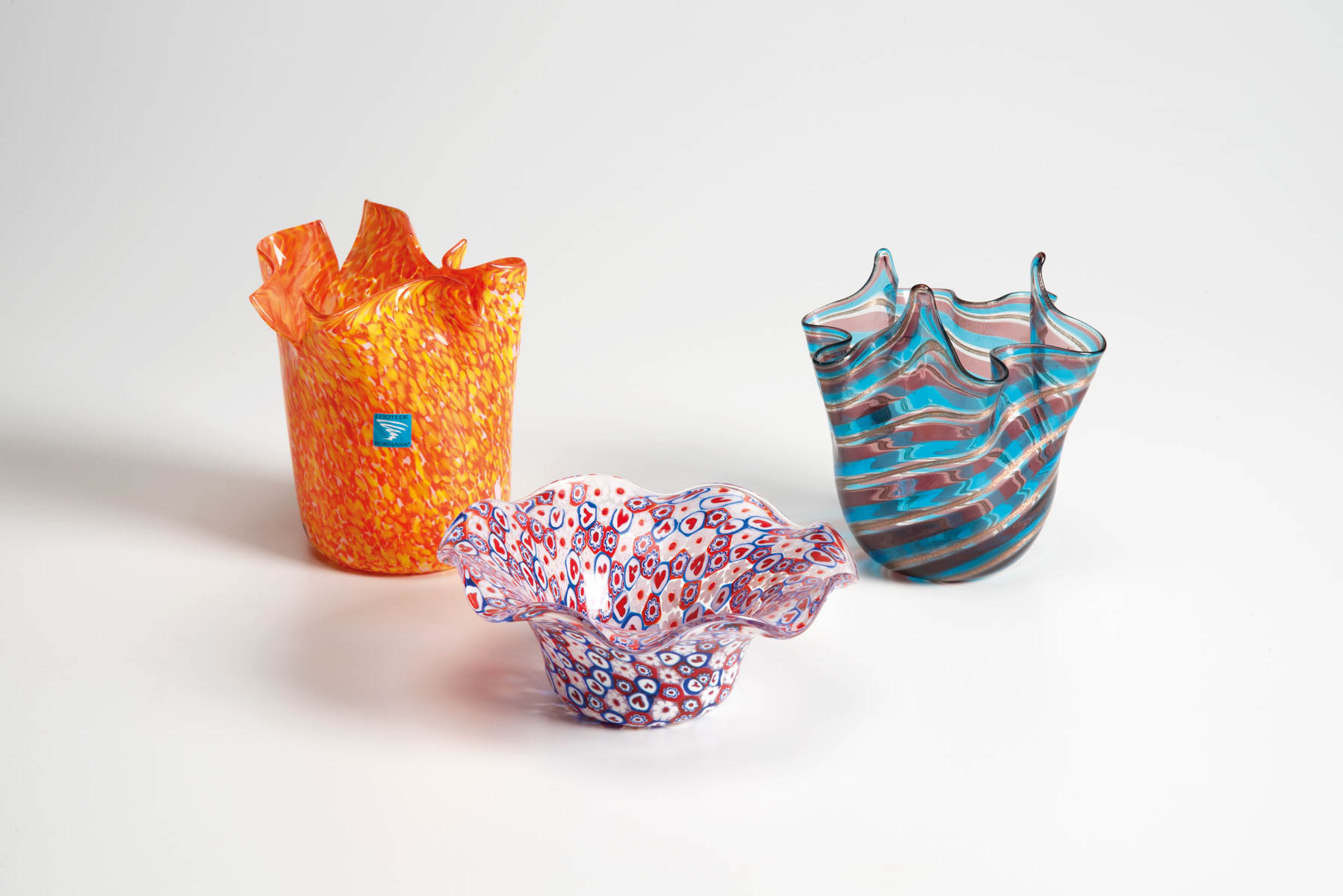 Manifaktur/Manifattura Murano Set di 3 vasi;Millefiori Fratelli Toso, Goto di Fornasa Barovier & Toso, vaso "fazzoletto"