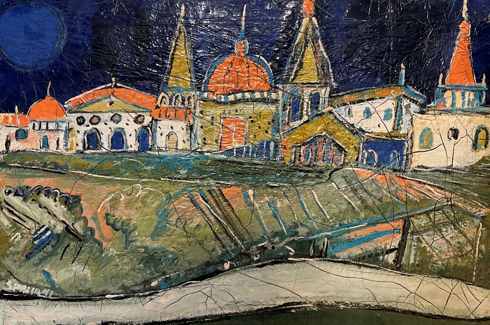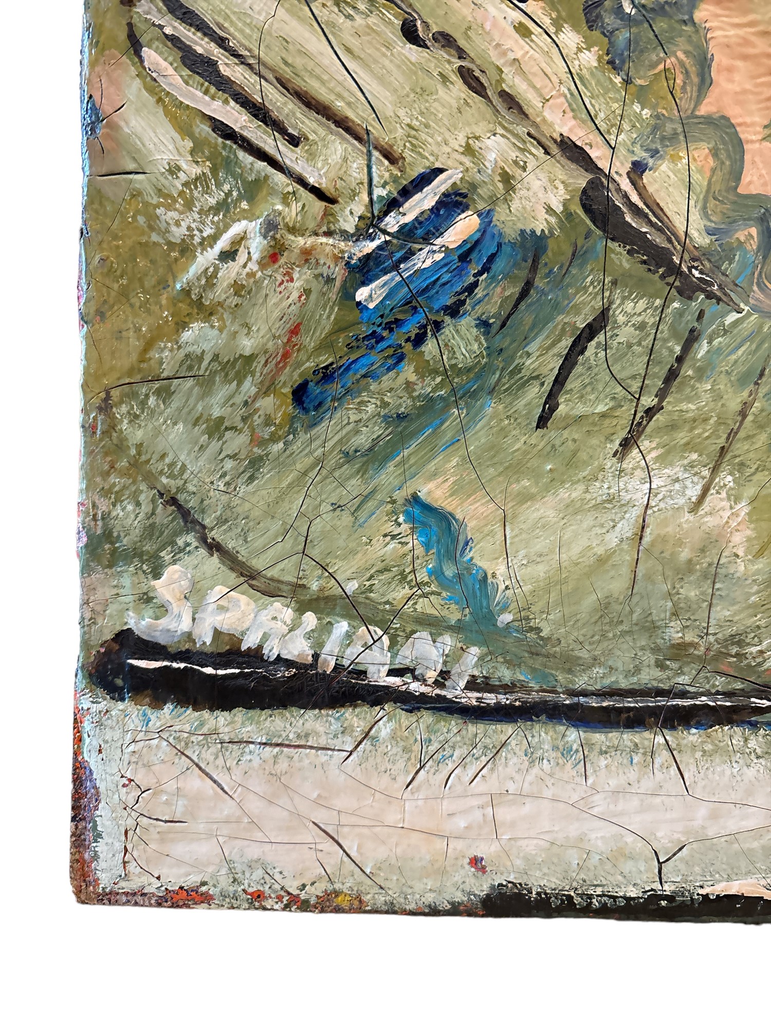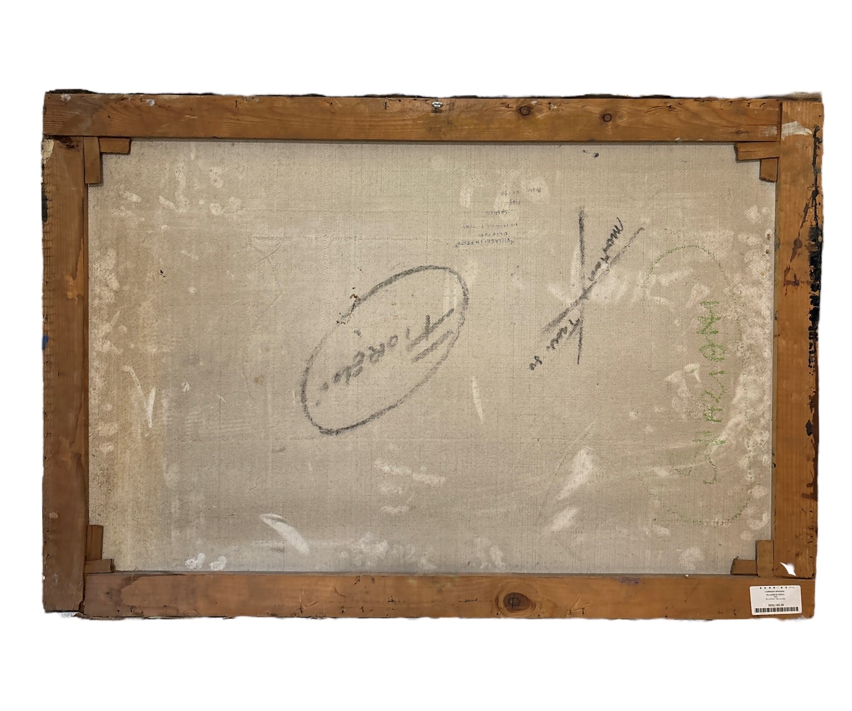 Olio su tela 61 x 91cm. Firmato al retro Spaziani. Reca iscrizione autografa "Villaggi in festa, olio puro...... Spaziani, 1969". Piccoli difetti.