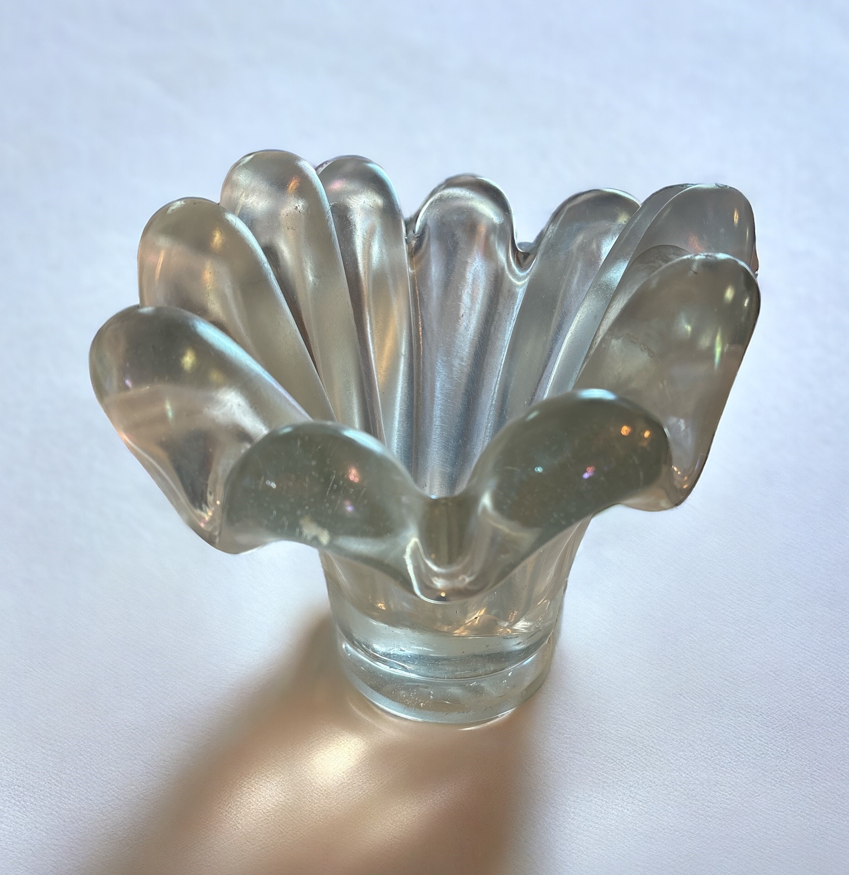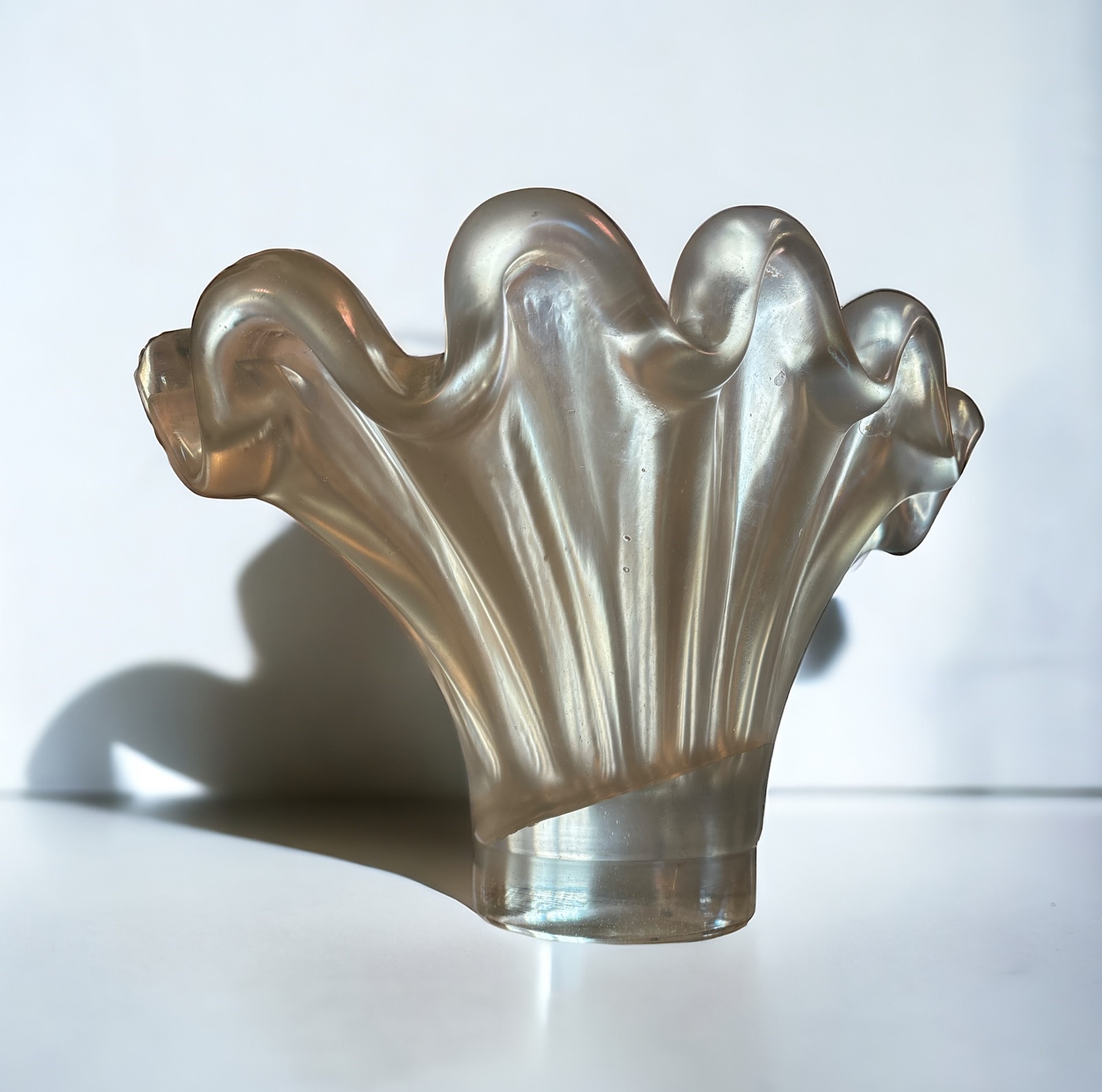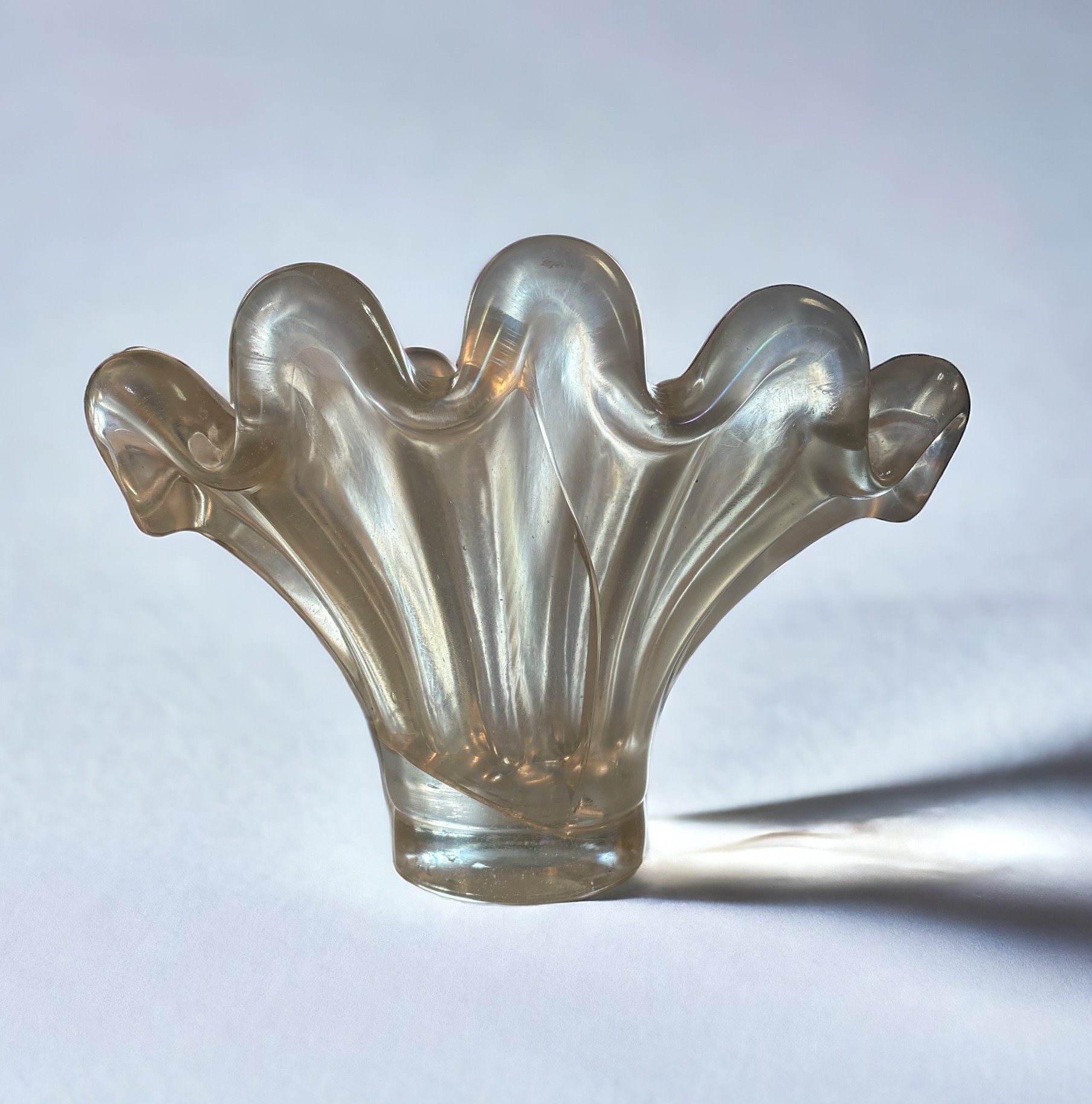 27 x 40cm. In vetro soffiato pesante con decoro di applicazioni. Superficie iridata. Difetti.