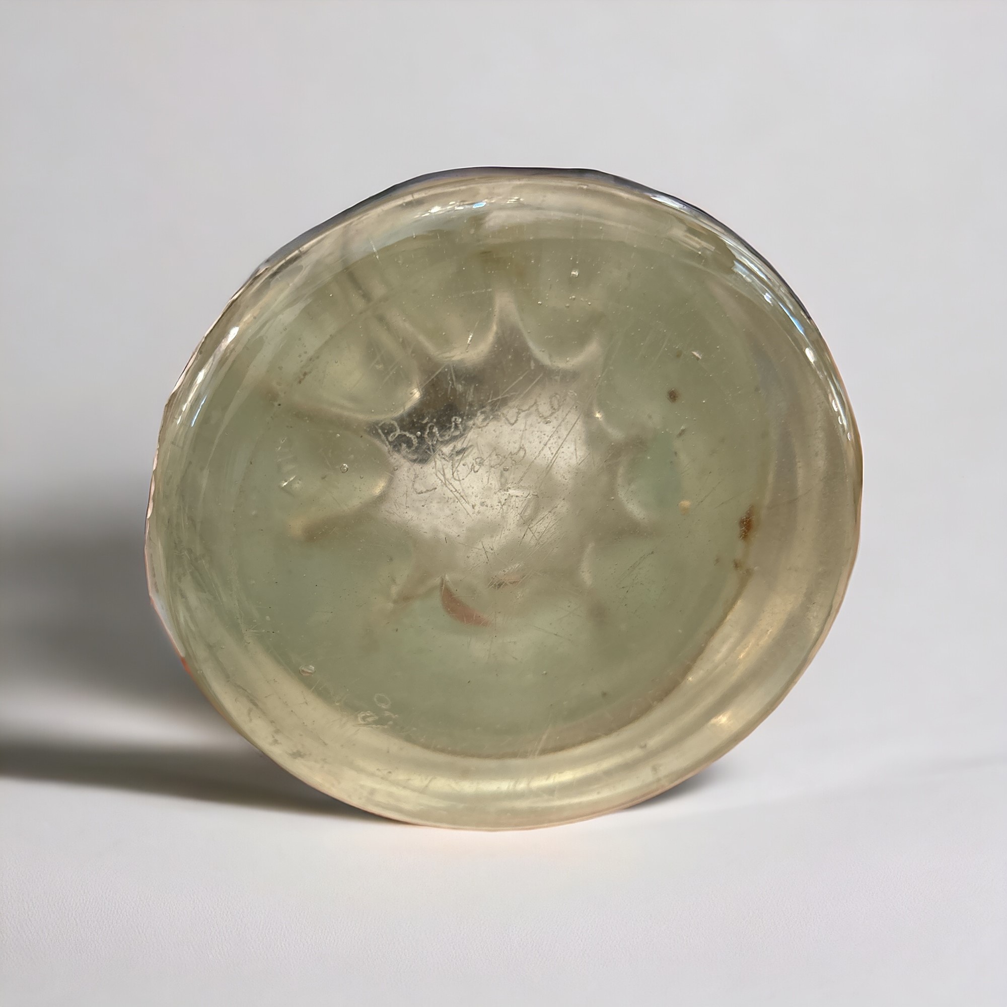 21 x 23cm. In vetro massiccio a fondo iridescente con sagoma a foglie. Firmato alla base.