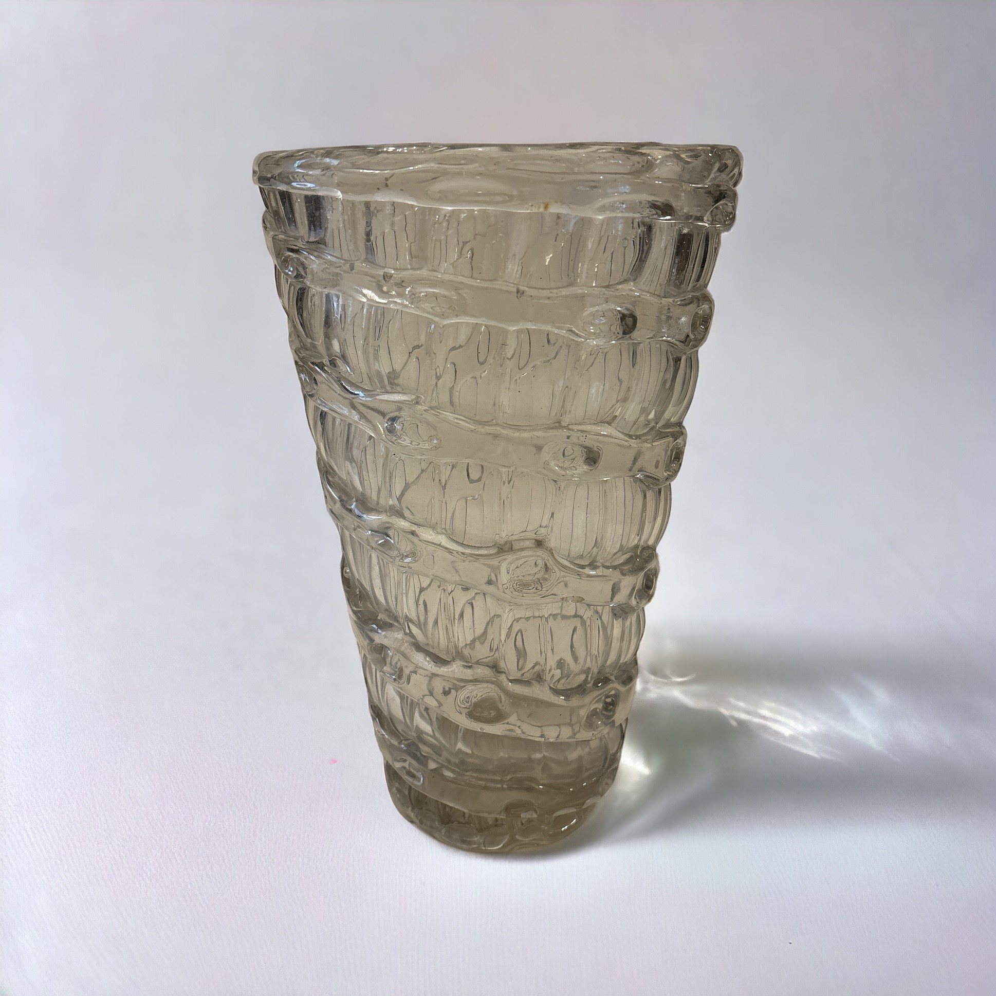 vetro di murano H 39 x 24 cm. Vaso tronco conico sezione ovale in spesso vetro incolore con leggere cotonature verticali, con applicazione di un nastro vitreo a spirale con tacche.