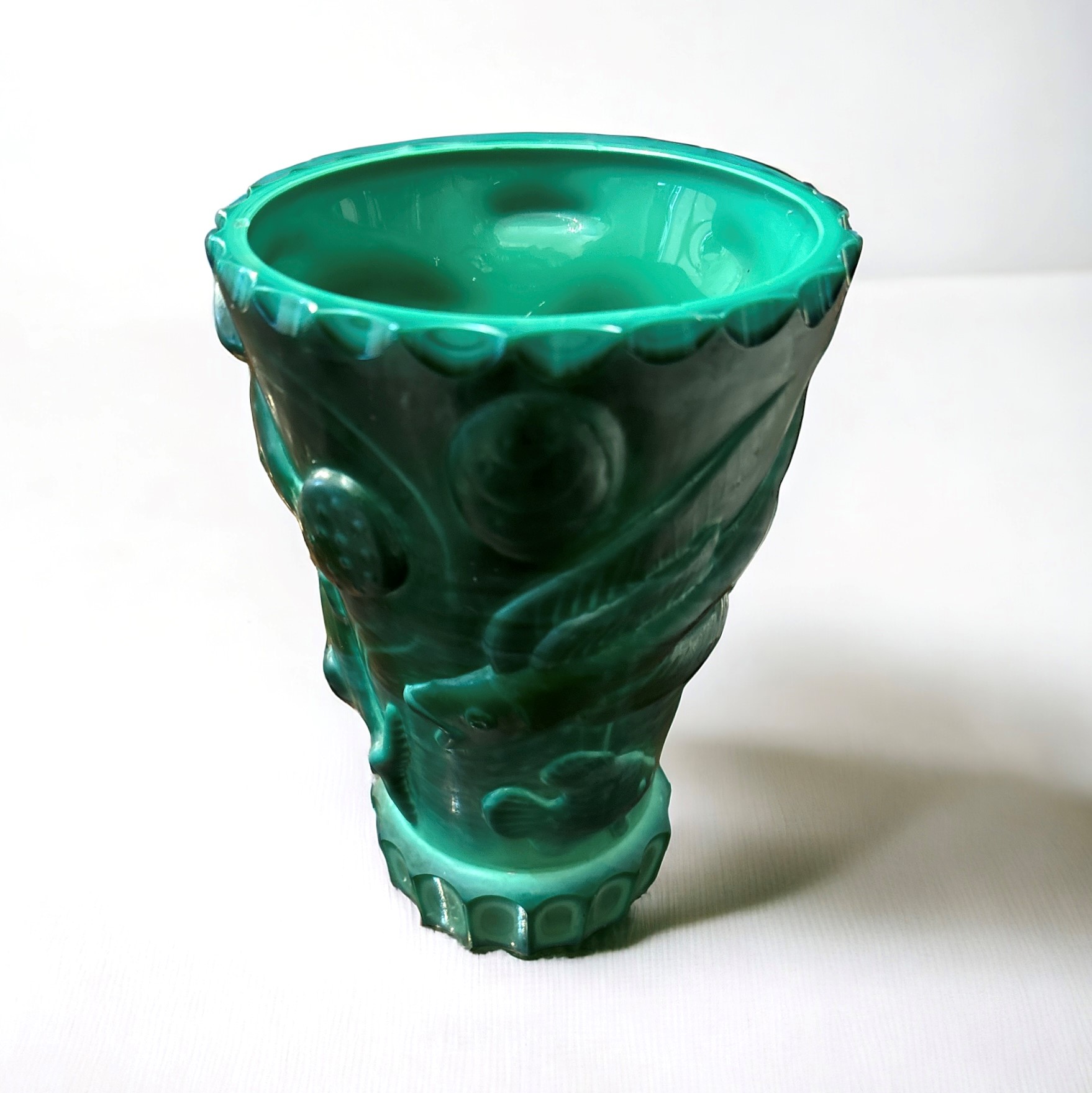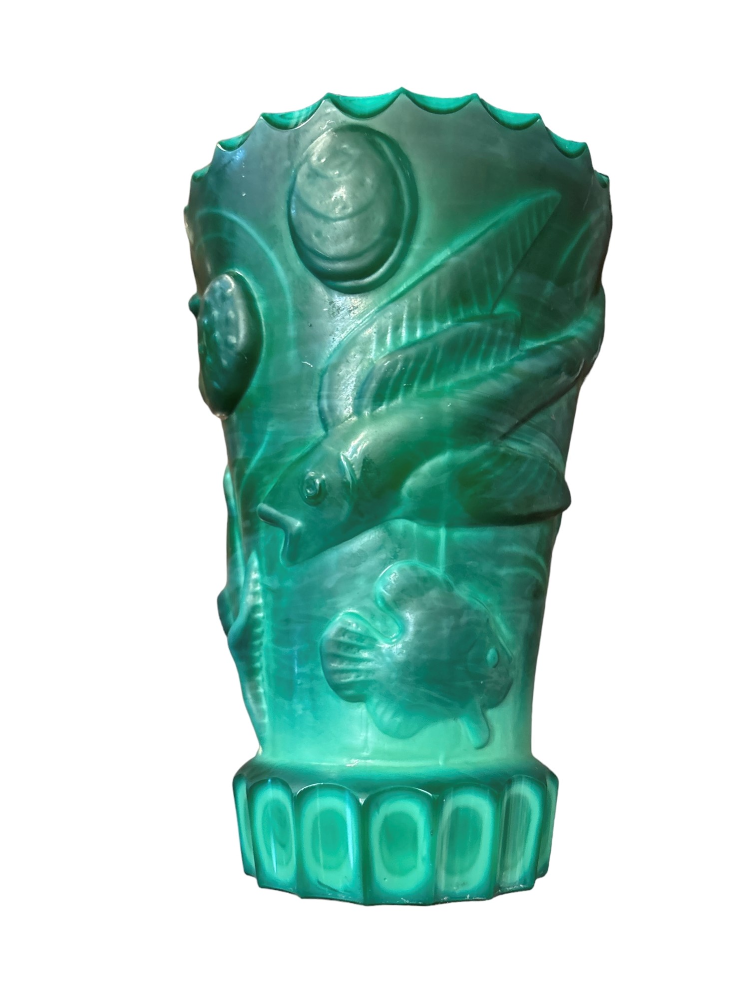h 18,5 cm x 13 cm. In vetro colorato. Con decorazioni marine a rilievo.