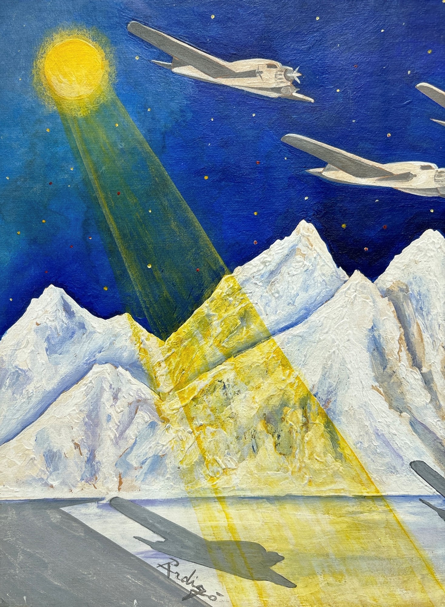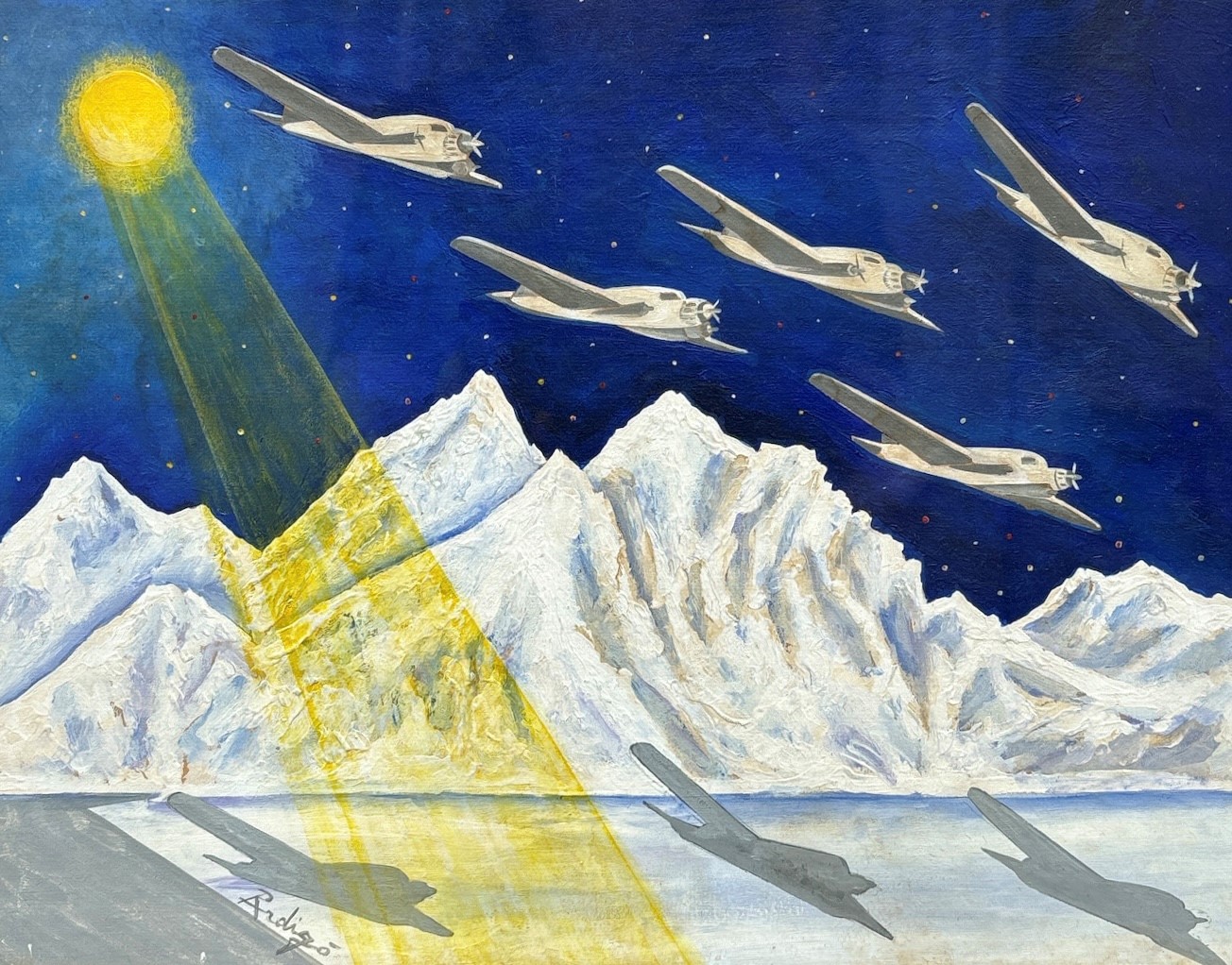 Petro Ardigò (XX secolo - ) Azione aereo futurista olio su carta applicata su tela cm 23,5 x 30