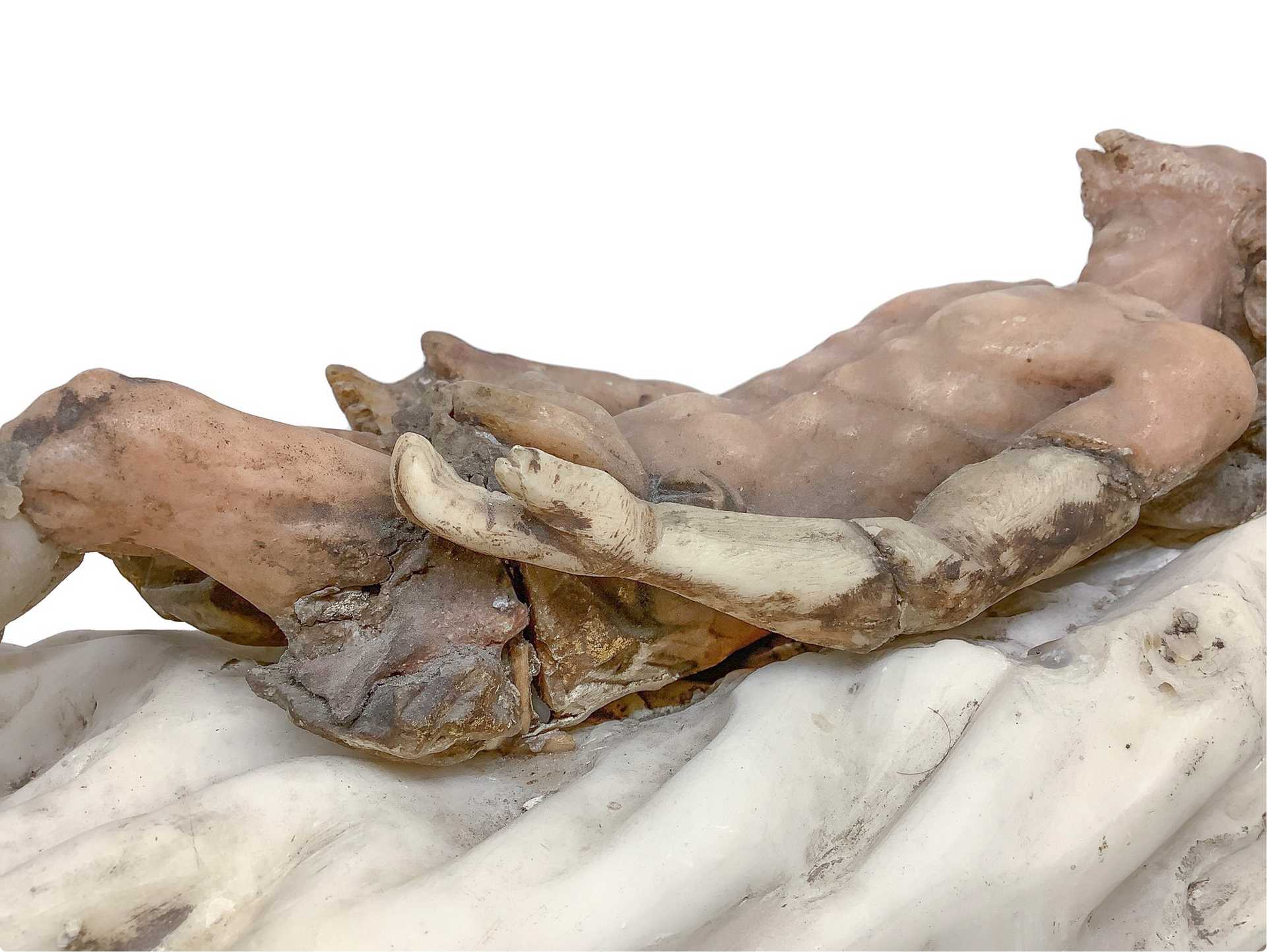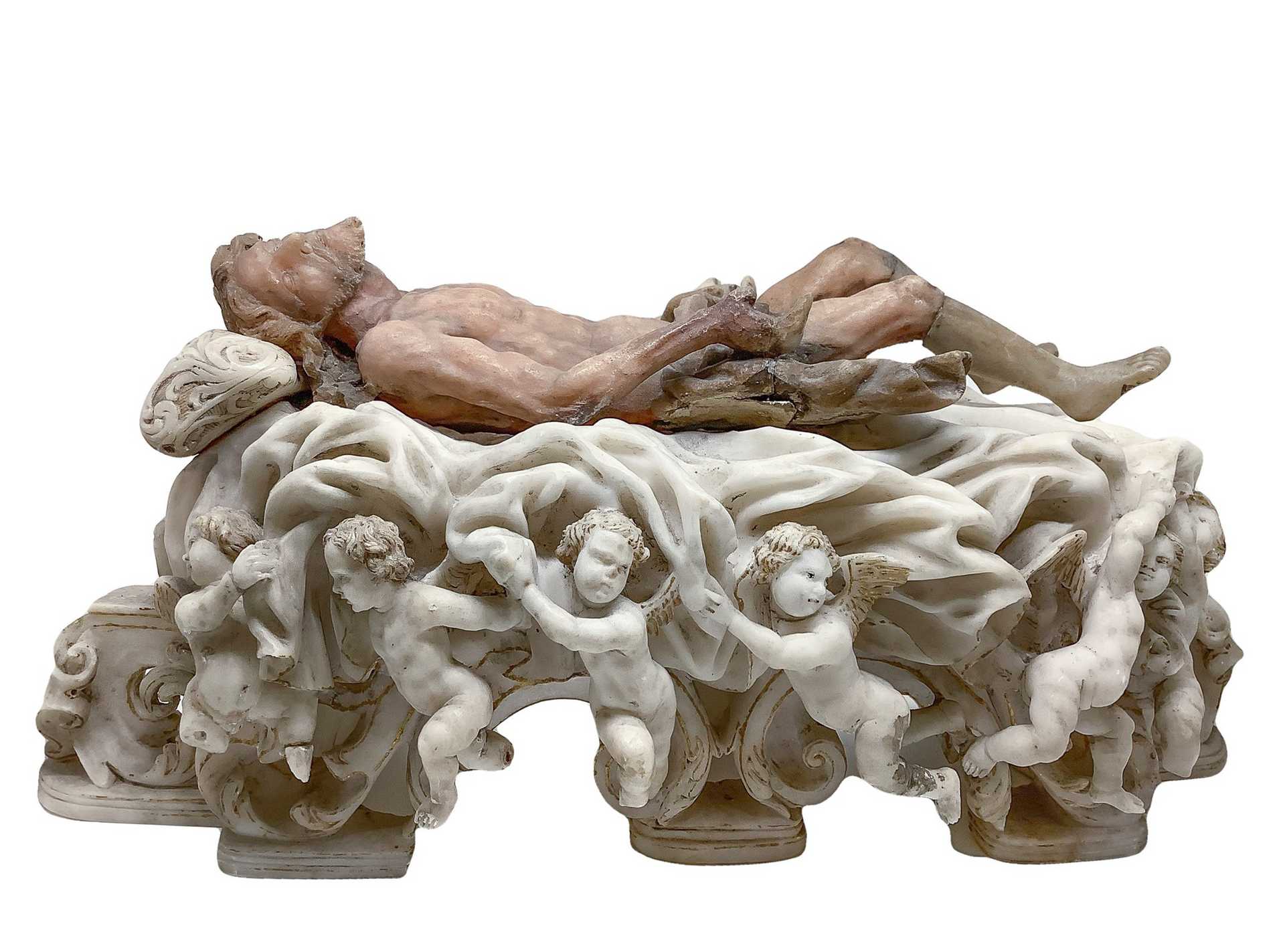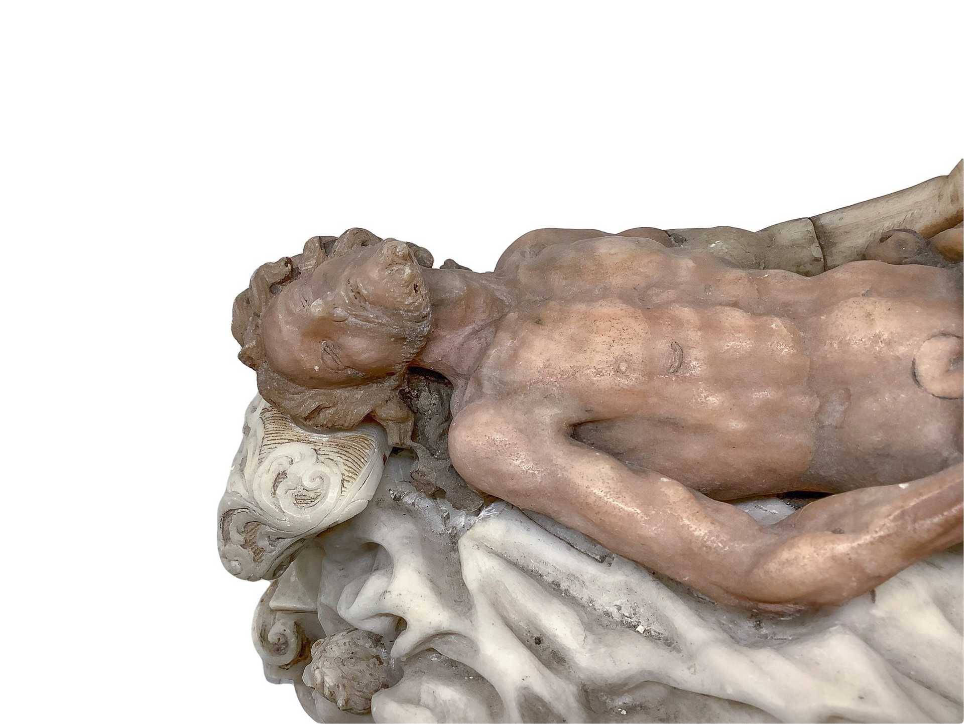 Scultura di Cristo in alabastro su letto sbalzato con putti, 16° Secolo