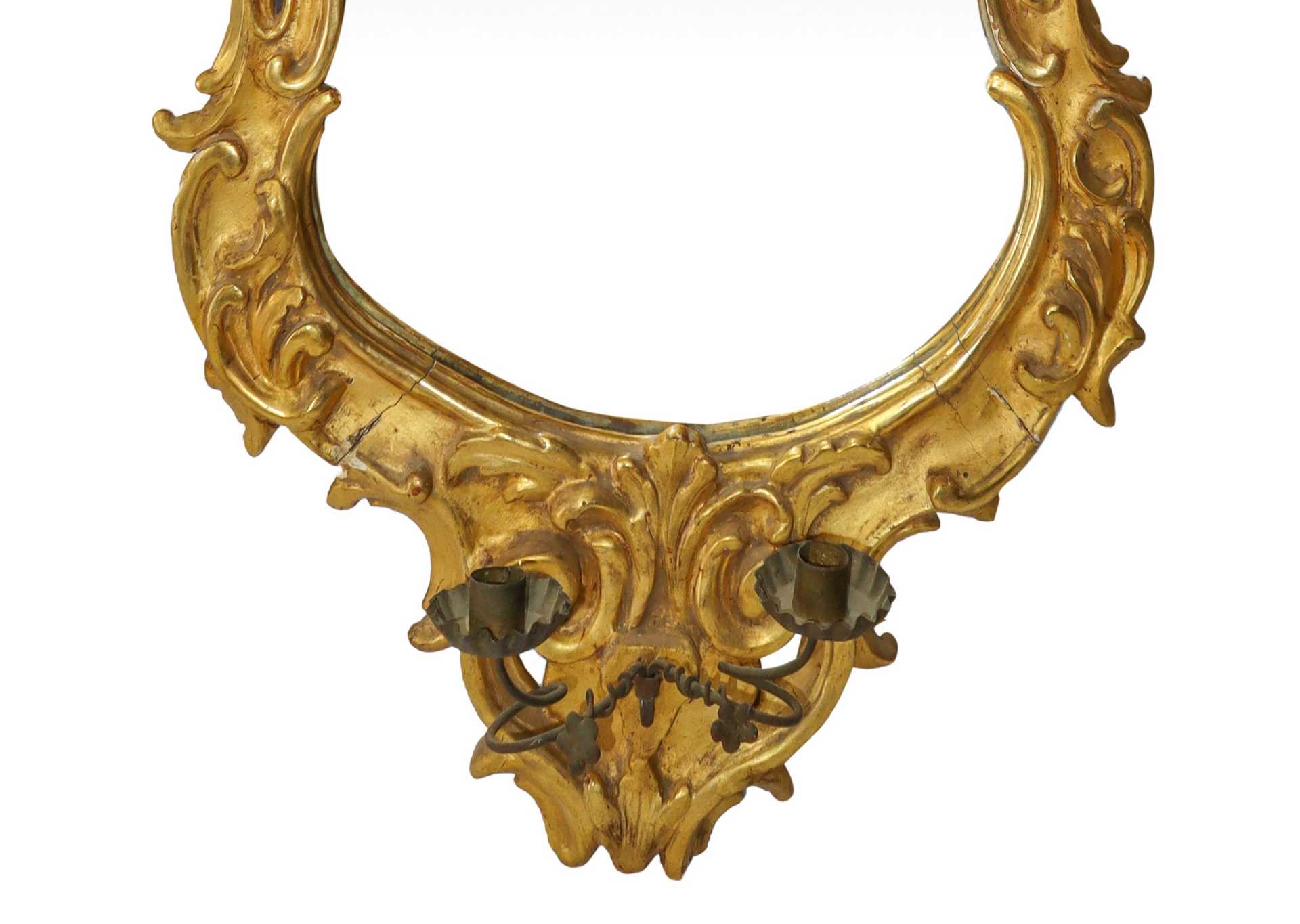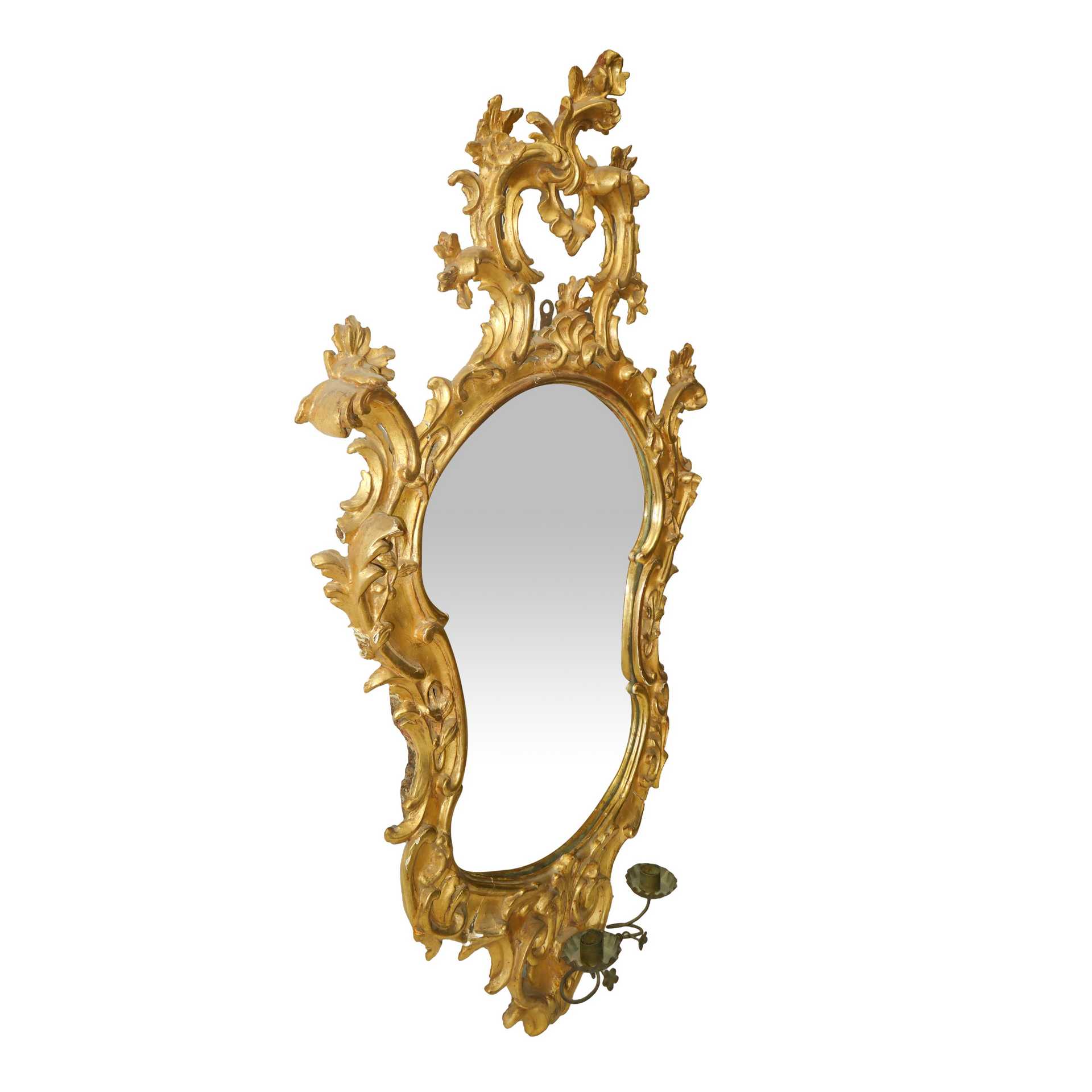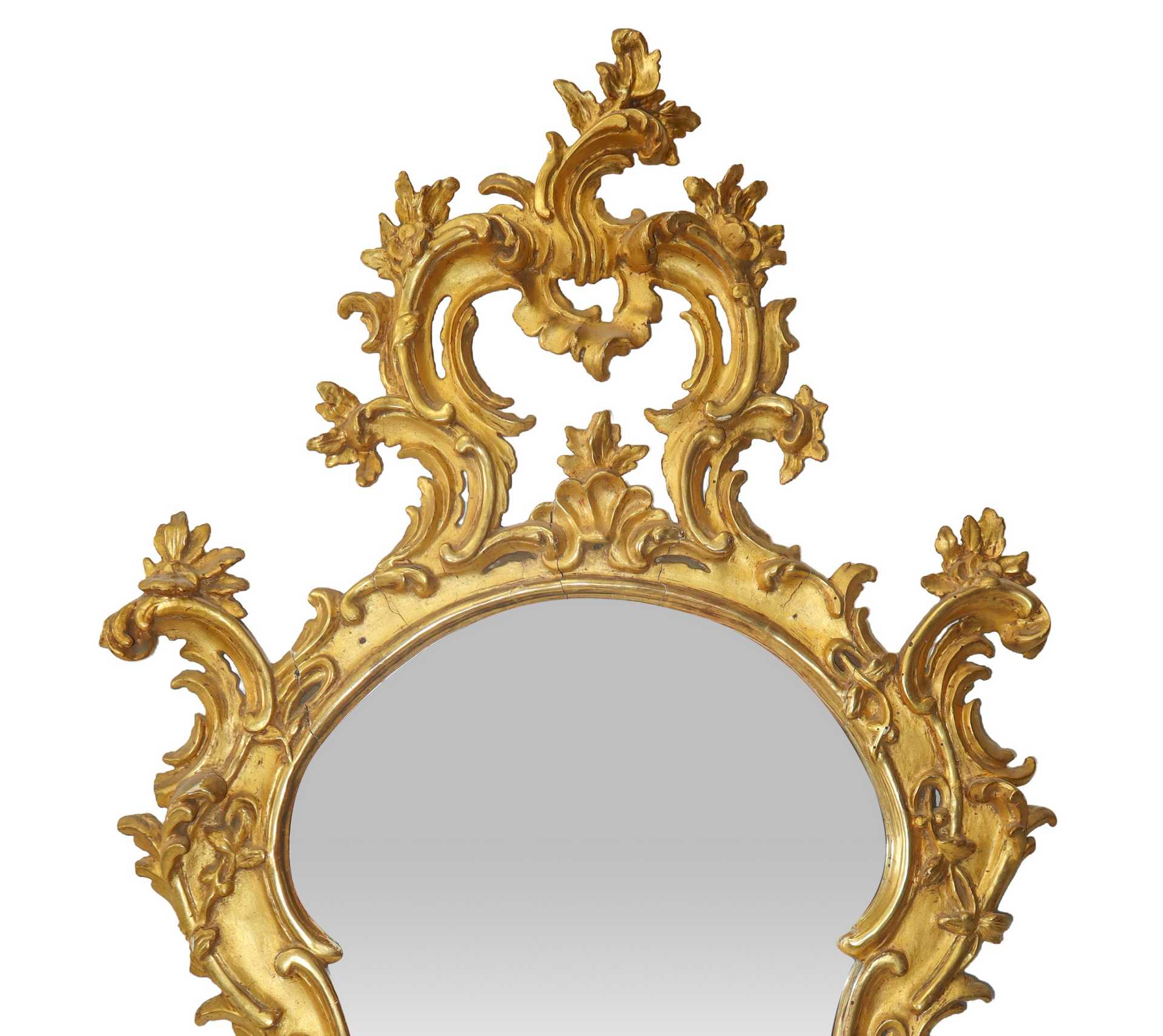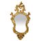 Specchiera Luigi XV in legno dorato scolpita con volute a larghe foglie e alla base ventolina a due
