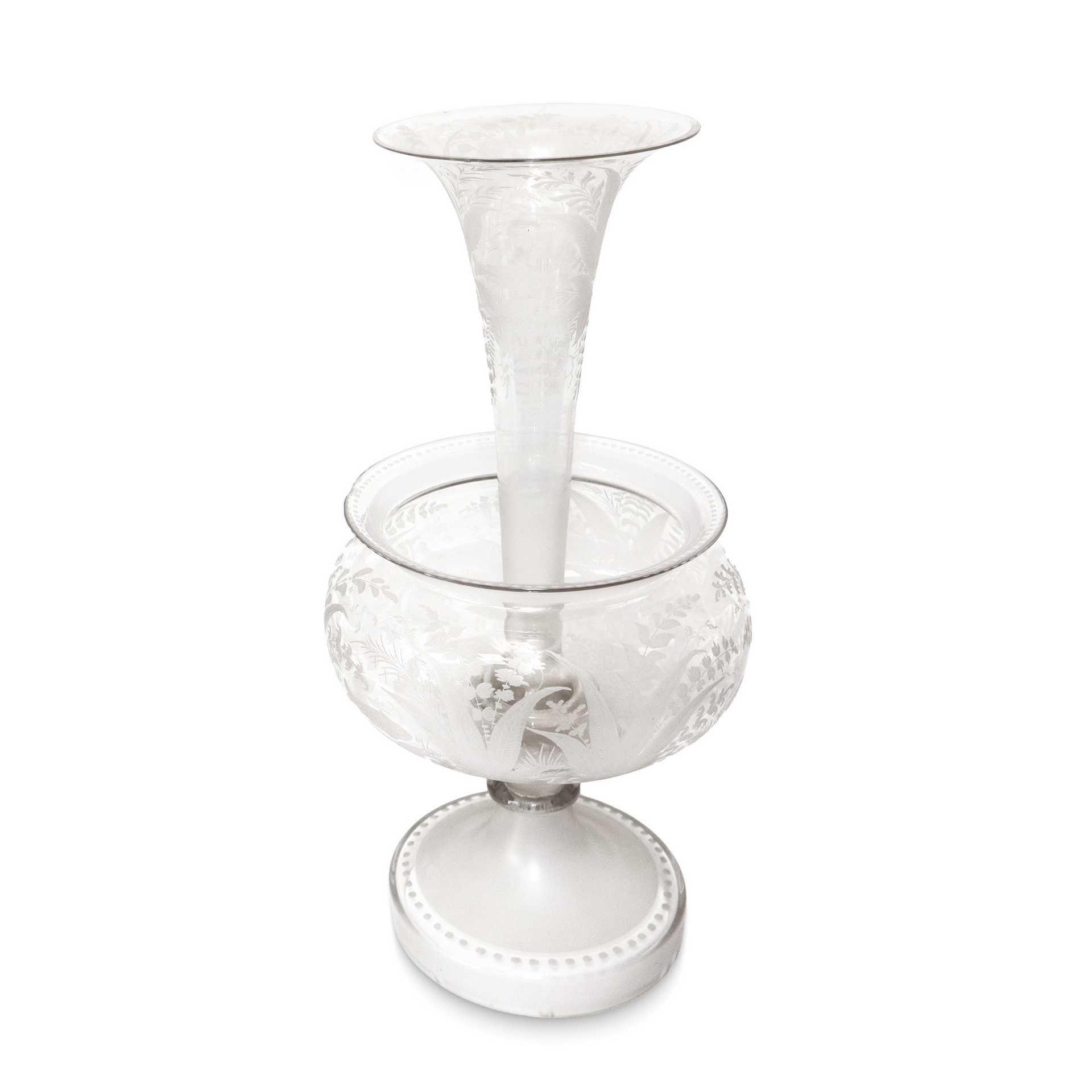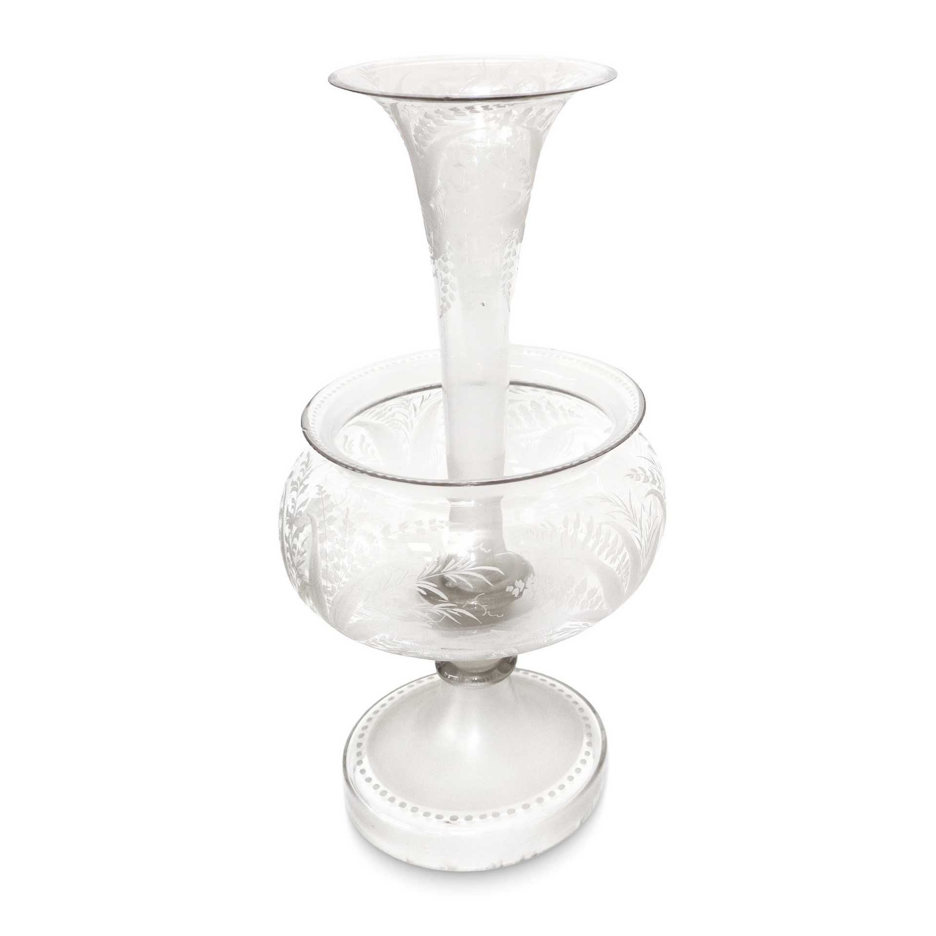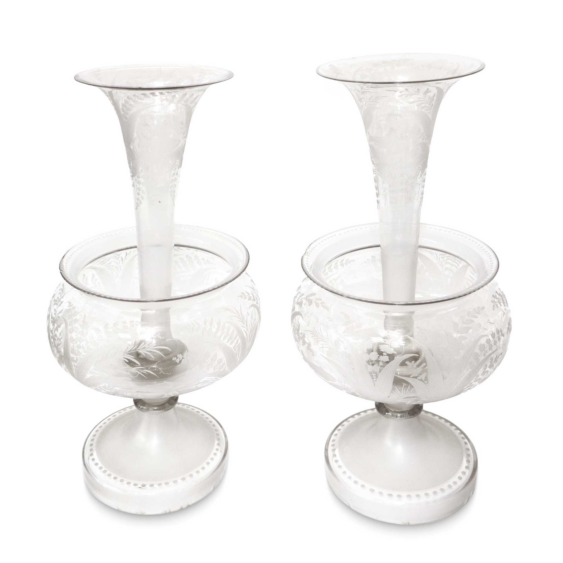 Coppia di vasi Vittoriani a due elementi in vetro bulinato e inciso con decori vegetali e di pesci,