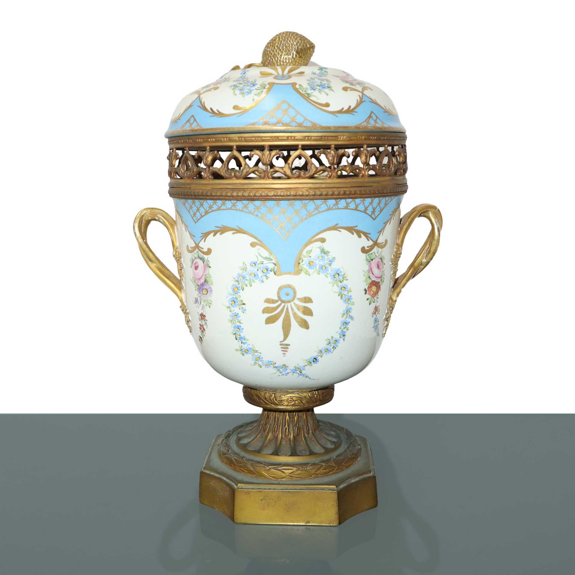 Vaso potiche in porcellana azzurra H cm 31x17 Con decori in dorato, manico del coperchio a forma di