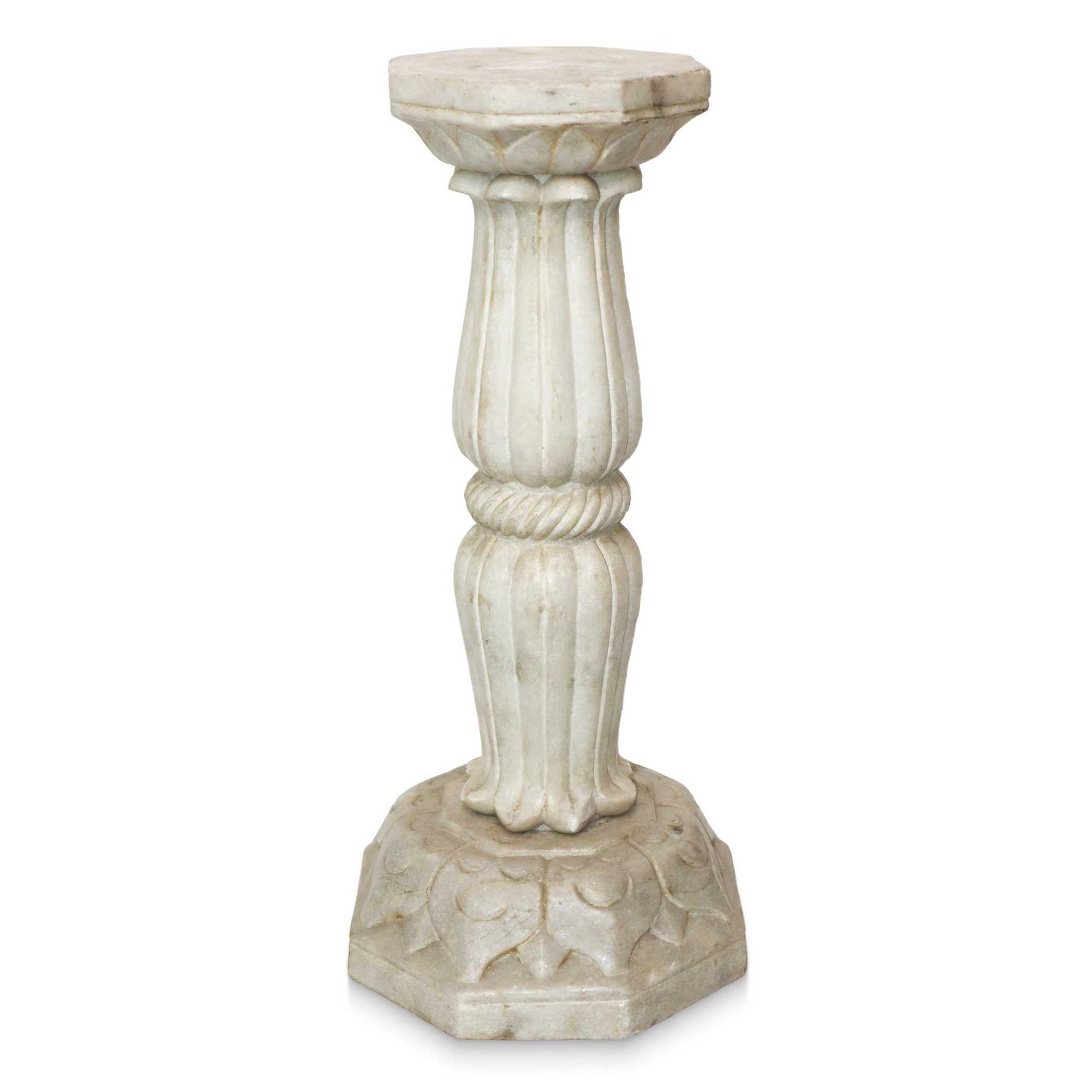Coppia di colonne in marmo scolpito con base ottagonale, colonna cordonata al centro e capitello ott