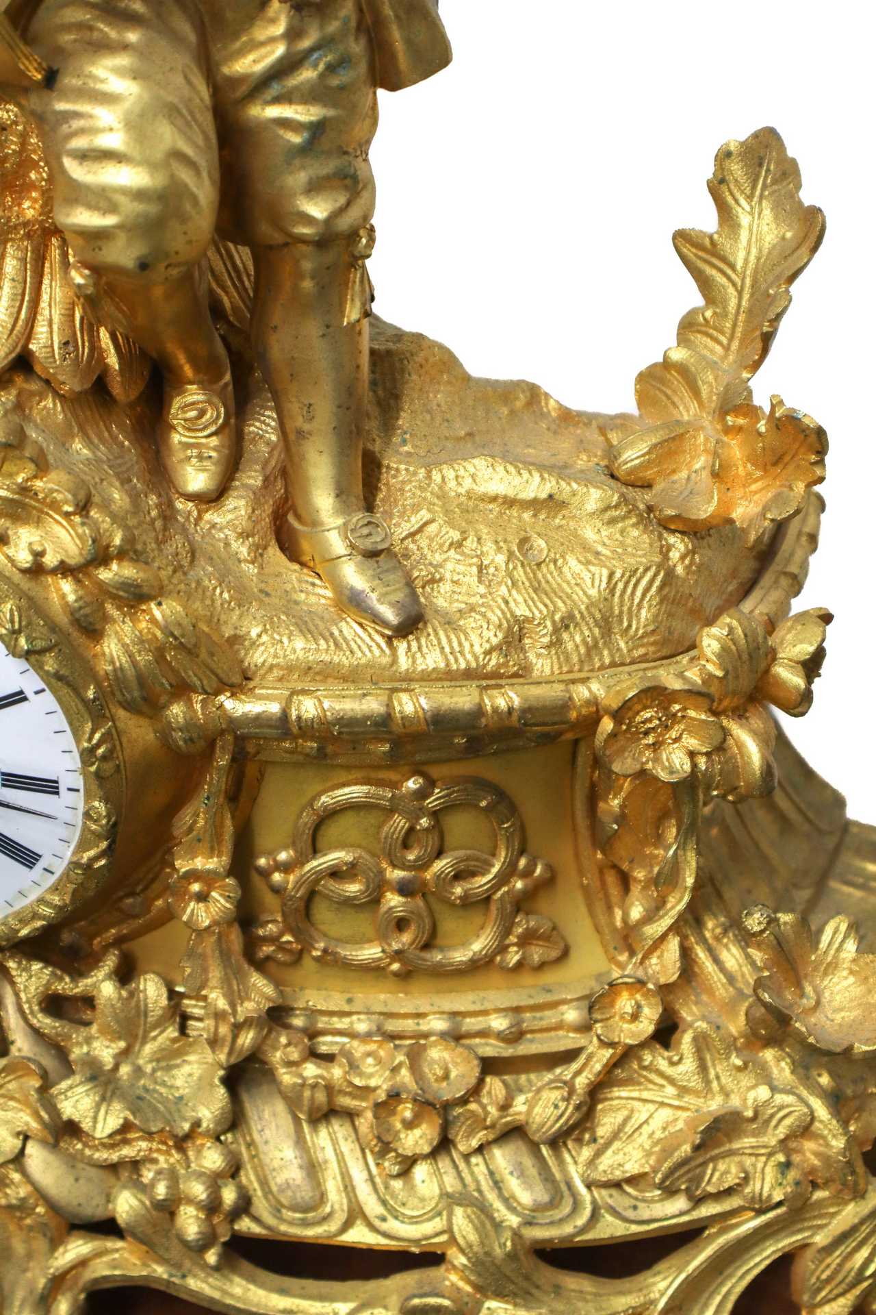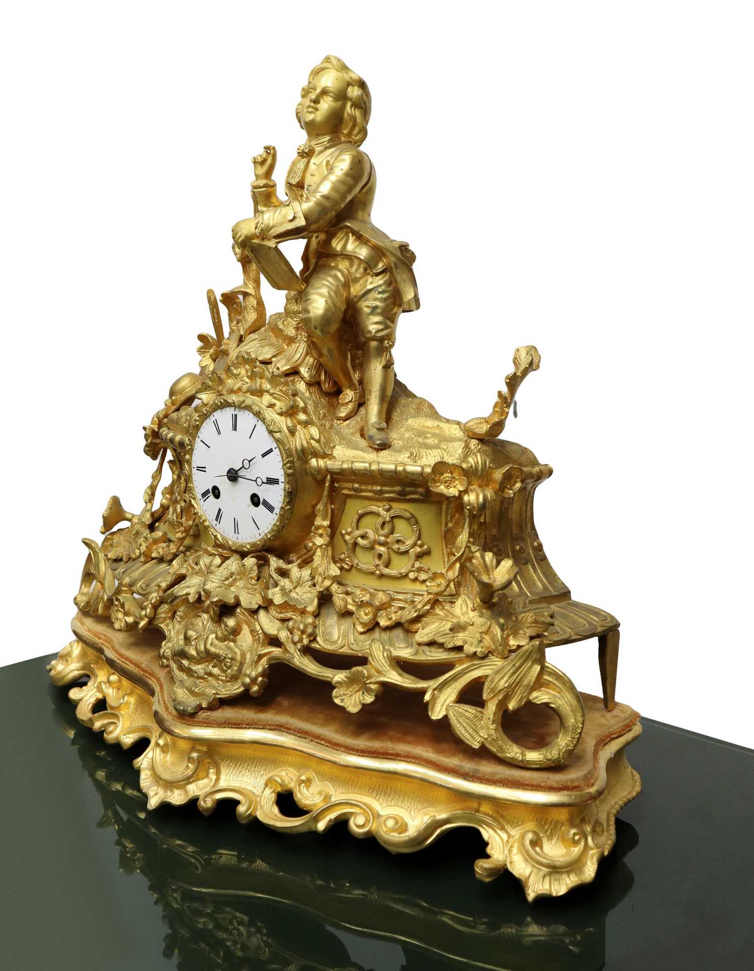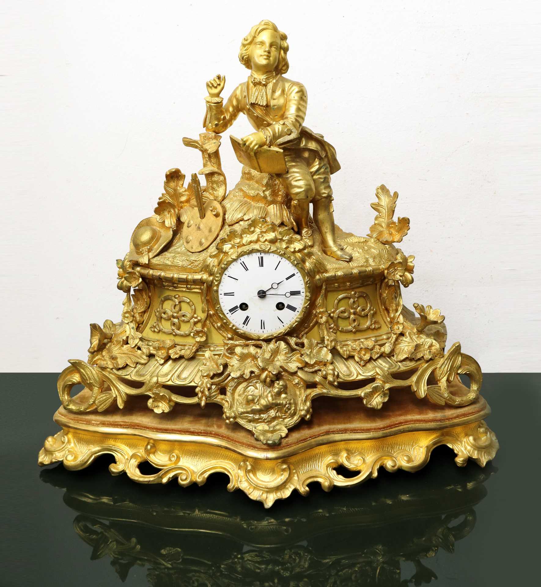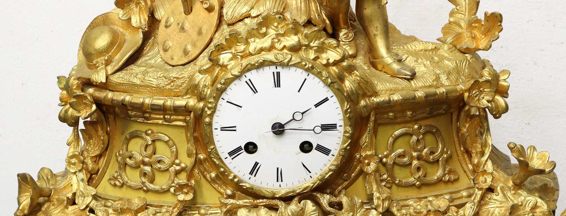 Orologio in metallo dorato in teca, 19° Secolo h cm 40 (con base 45) x cm 40 x cm 15 Con base