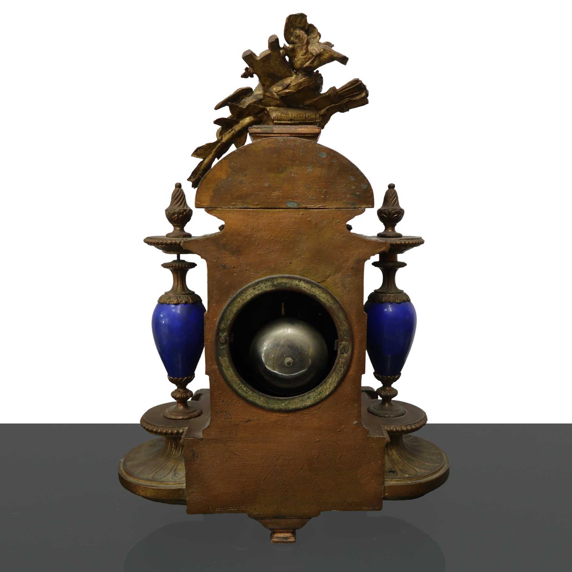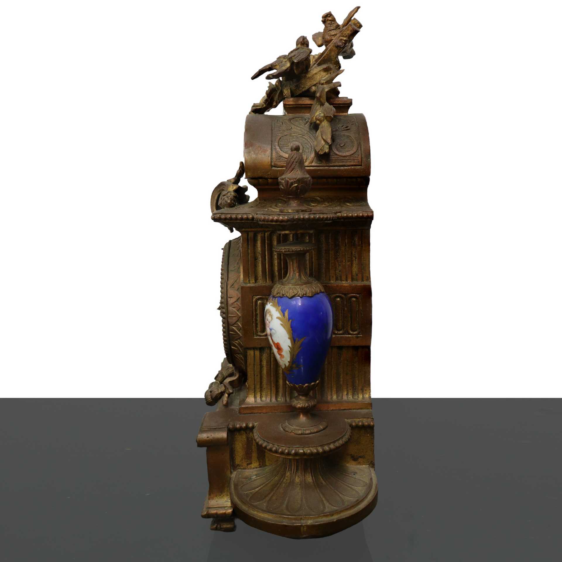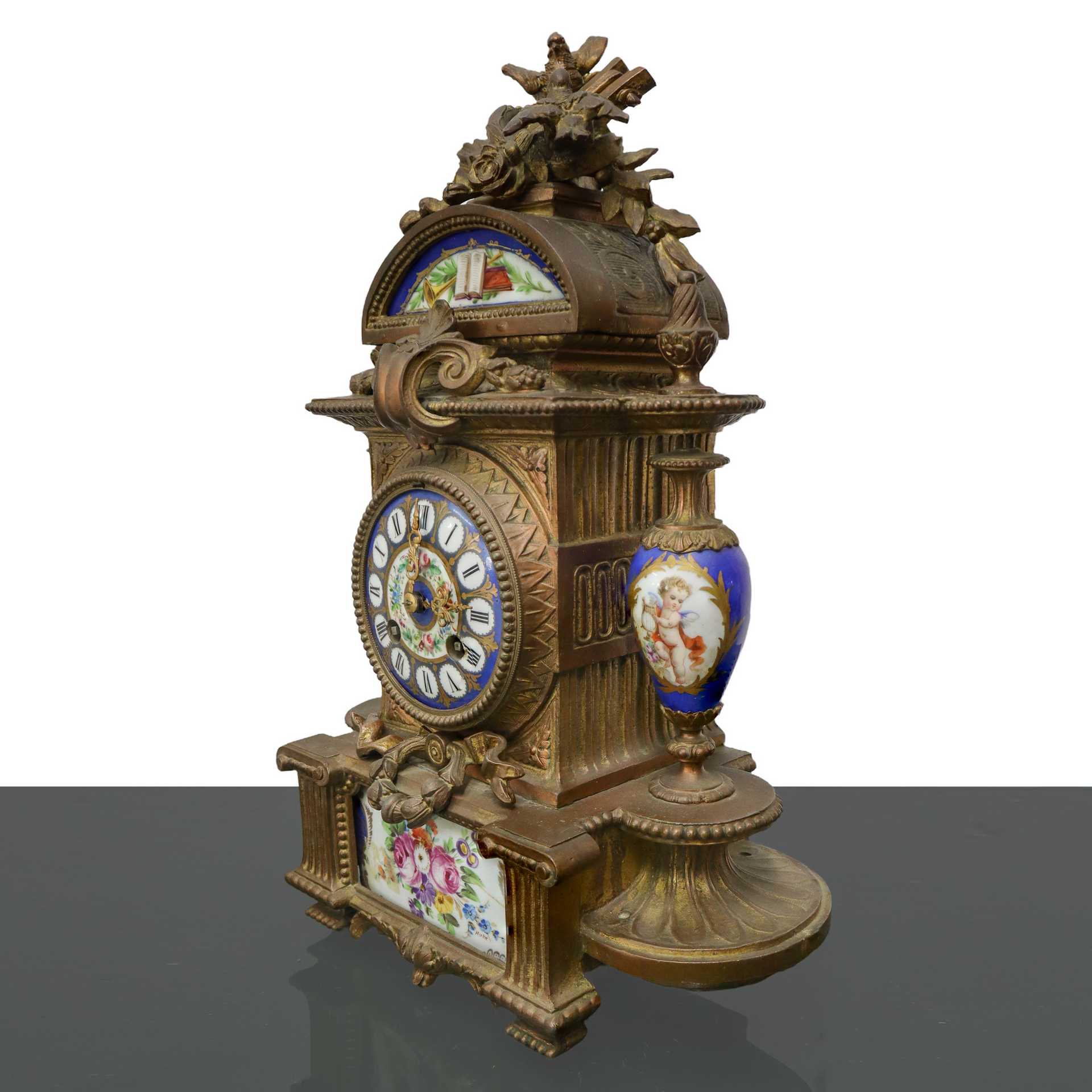 Orologio a pendolo da tavolo in bronzo dorato e porcellane applicate stile di Sevres, 19° Seco