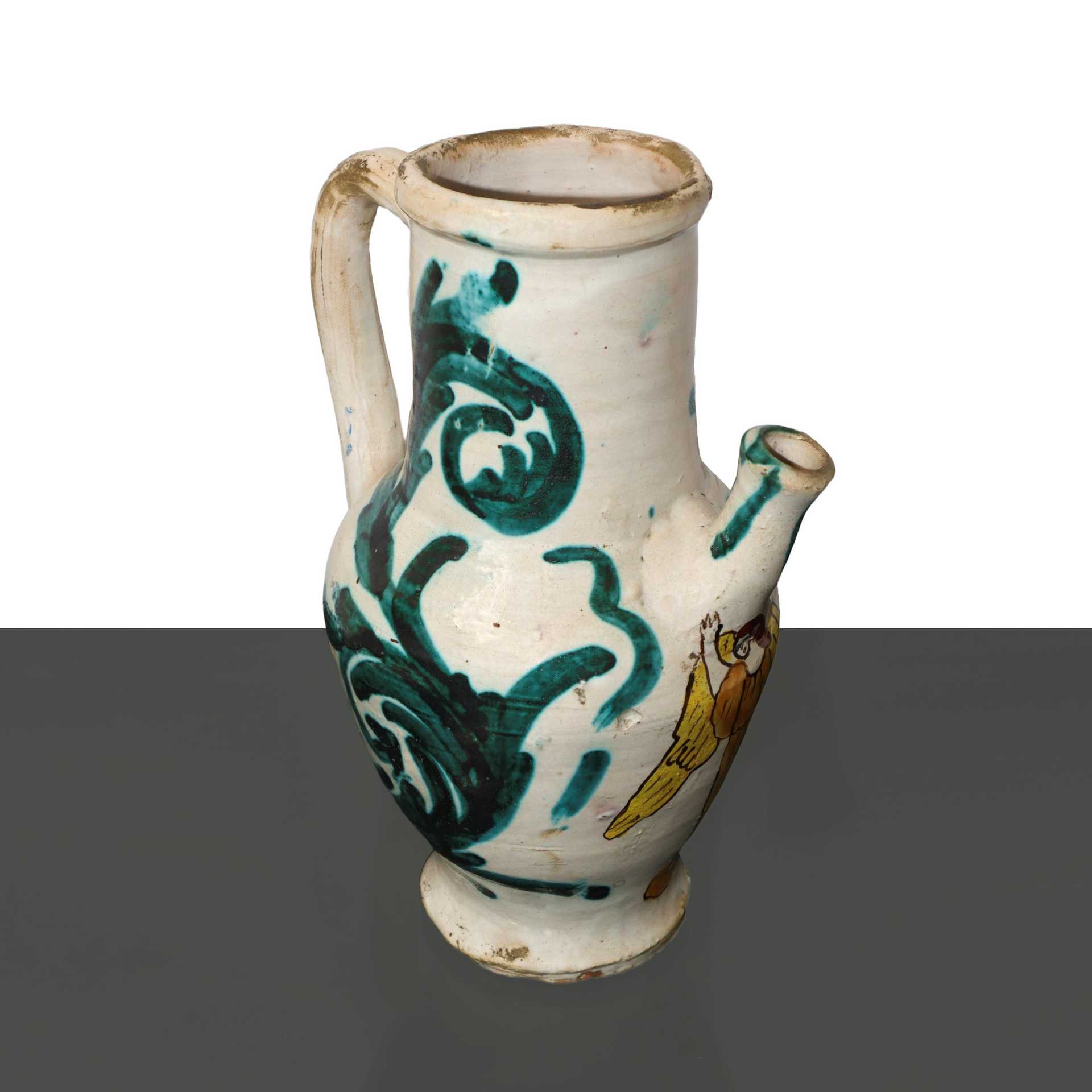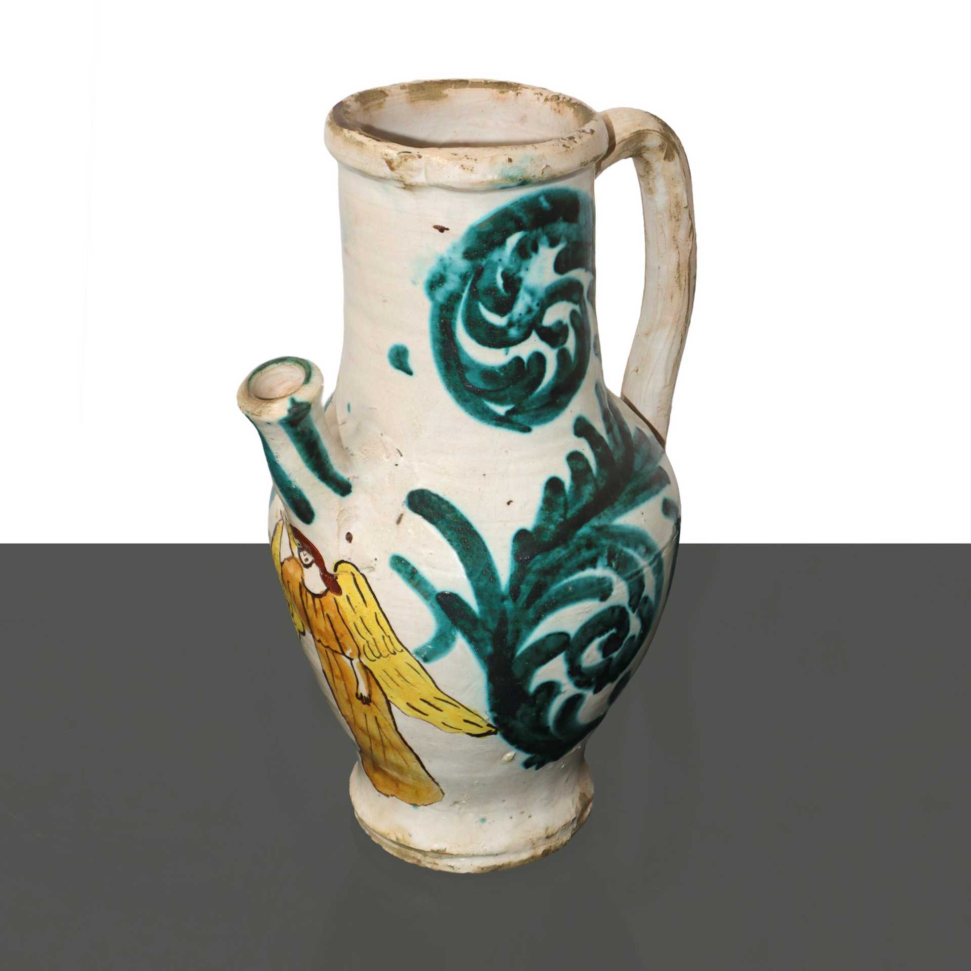 Versatoio con manico in maiolica di Caltagirone , 20° Secolo H cm 27 Con angelo sul fronte.Con ange
