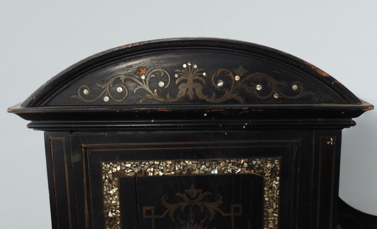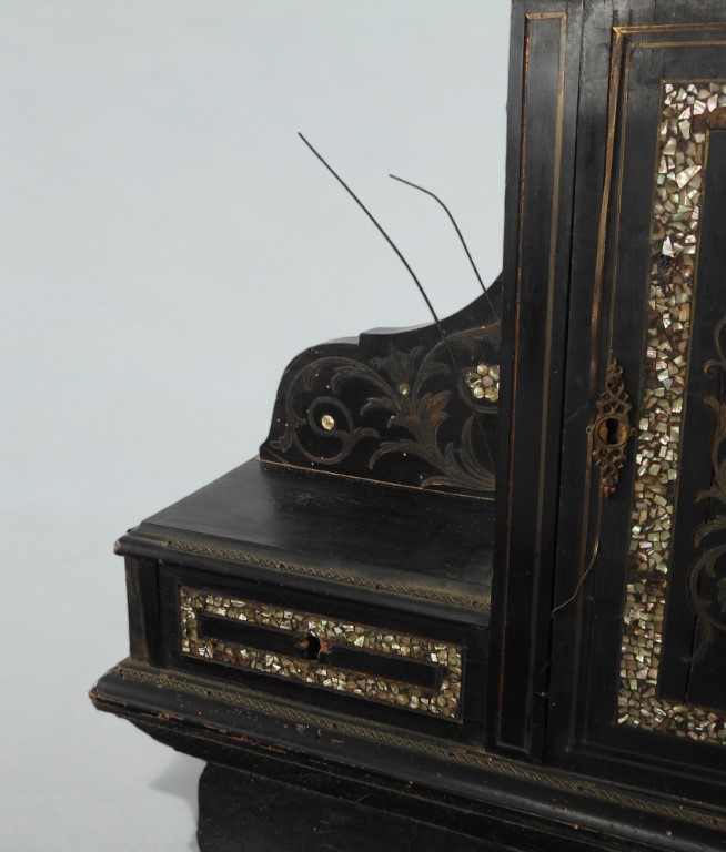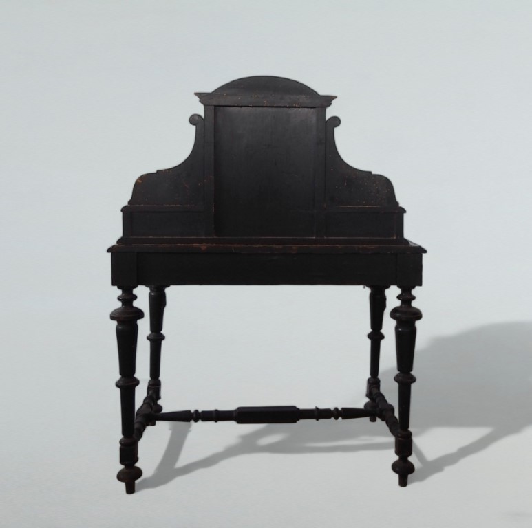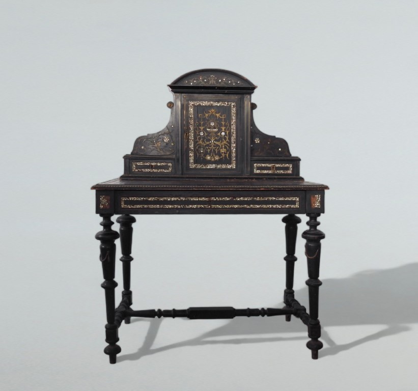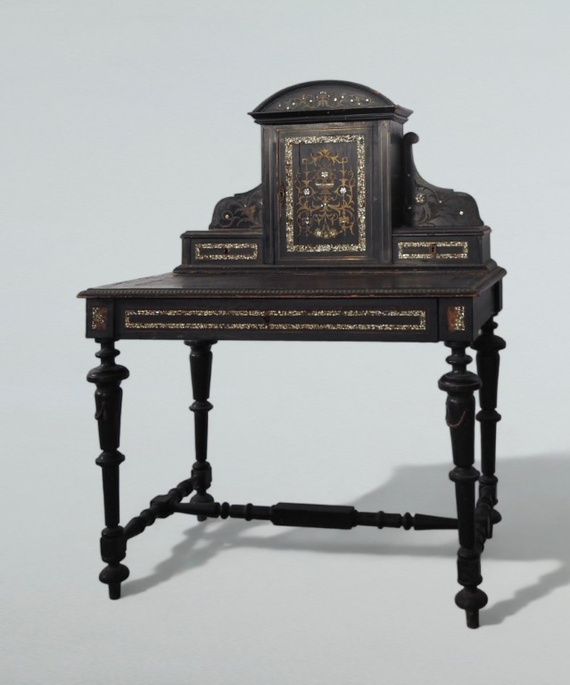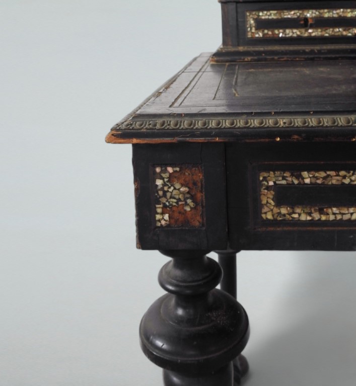 Scrivania in legno ebanizzato ed intarsiato in madreperla ed ottone